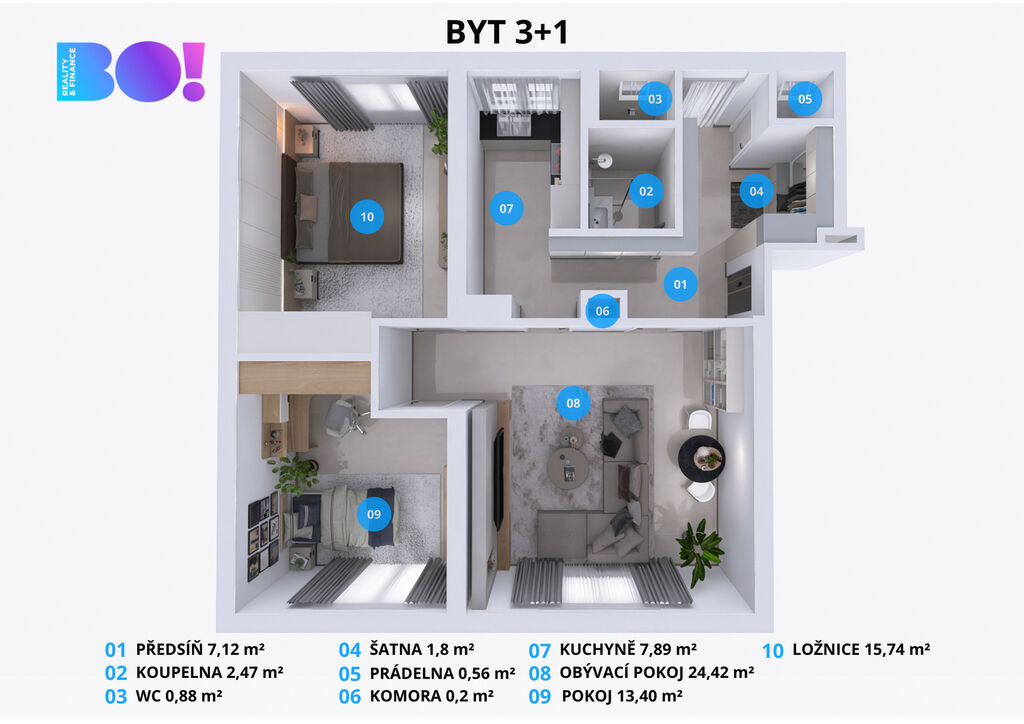 V předsíni je vestavěná skříň připravená na pračku a sušičku, hned u vstupu do kuchyně praktický kumbál na úklidové potřeby a nad vstupem úložný prostor třeba na sezónní věci. Kuchyň je plně vybavena – myčka, trouba, varná deska, lednice i dřez. V ložnici je k dispozici prostorná vestavěná skříň. Zbylý nábytek, který je viditelný na vizualizacích nebude součástí bytu.