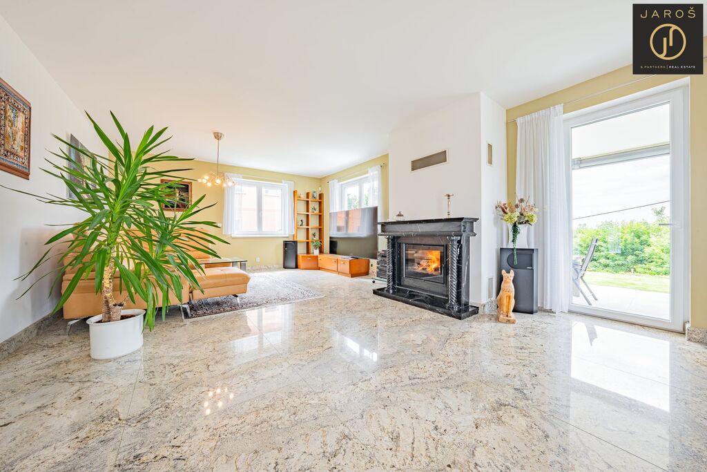 V přízemí najdete prostornou vstupní chodbu, kuchyni propojenou s jídelnou a obývacím pokojem, pracovnu a koupelnu se sprchovým koutem. Obývací část je vzdušná a příjemně propojená s exteriérem – nechybí krb a přímý vstup na terasu s markýzou, ideální pro posezení v soukromí zahrady.