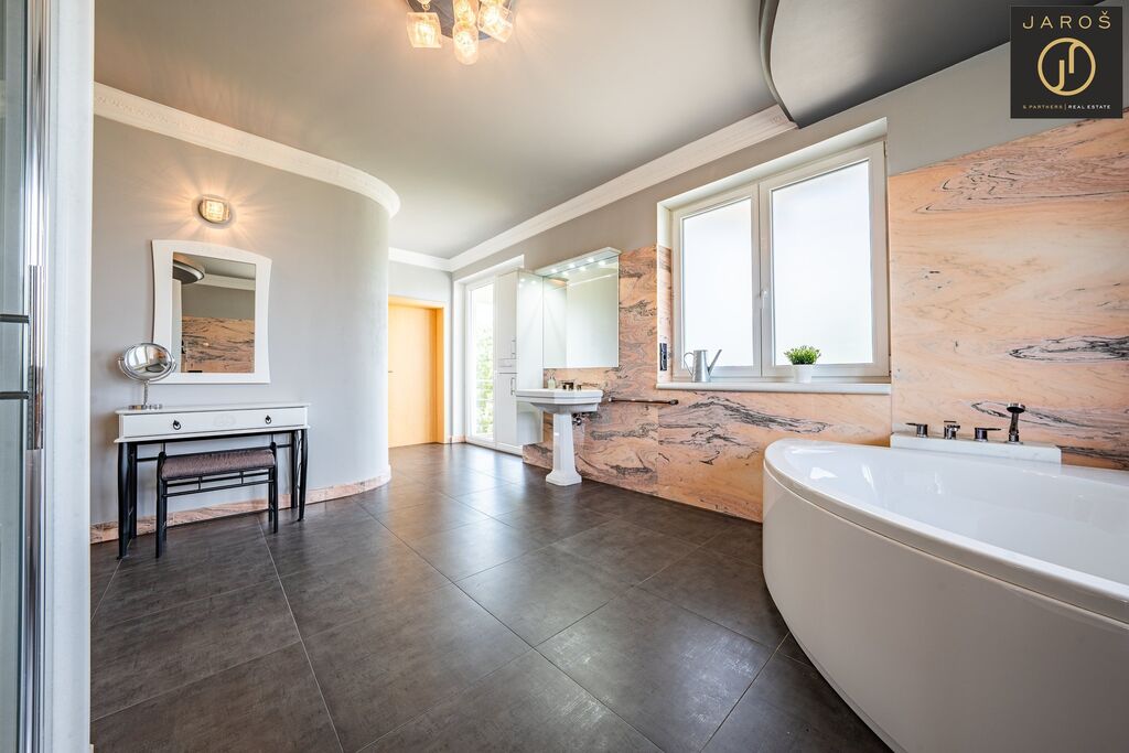 V patře se nachází hlavní ložnice s vlastní šatnou, dvě další ložnice, velká koupelna s vanou i sprchovým koutem a dva balkony – menší u koupelny (6 m²) a větší terasa (20 m²) přístupná z ložnice i dalšího pokoje. Z terasy se otevírá nádherný výhled na Karlovy Vary a okolní krajinu.