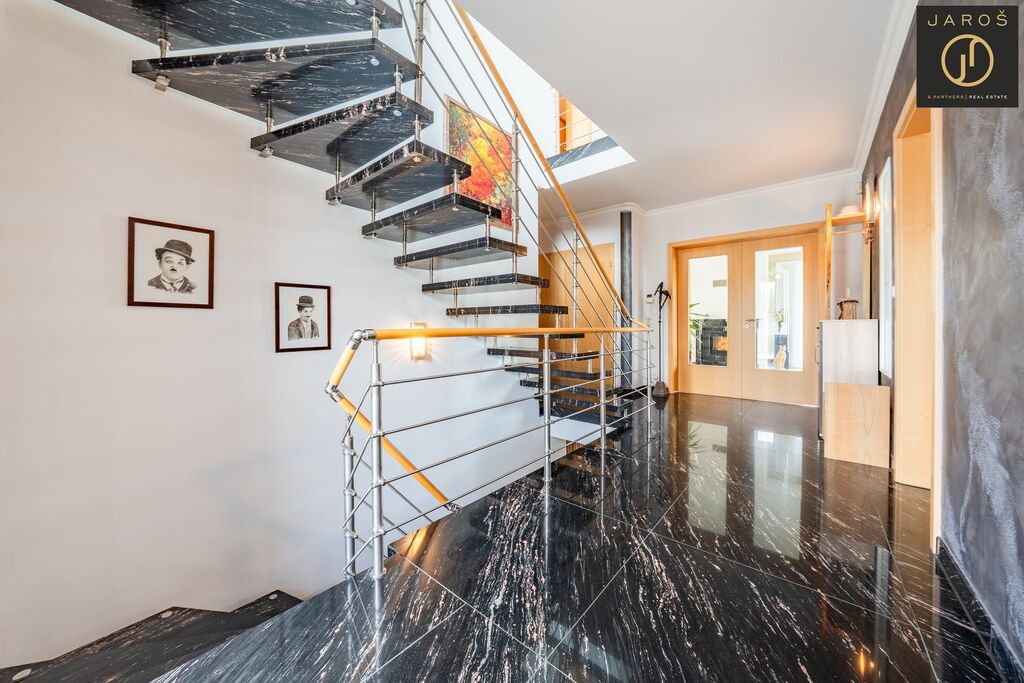 Interiér je zpracován ve vysokém standardu – byly zde použity drahé přírodní materiály, včetně žulových a mramorových obkladů. Dominantním prvkem je žulové samonosné schodiště, které propojuje všechna podlaží.