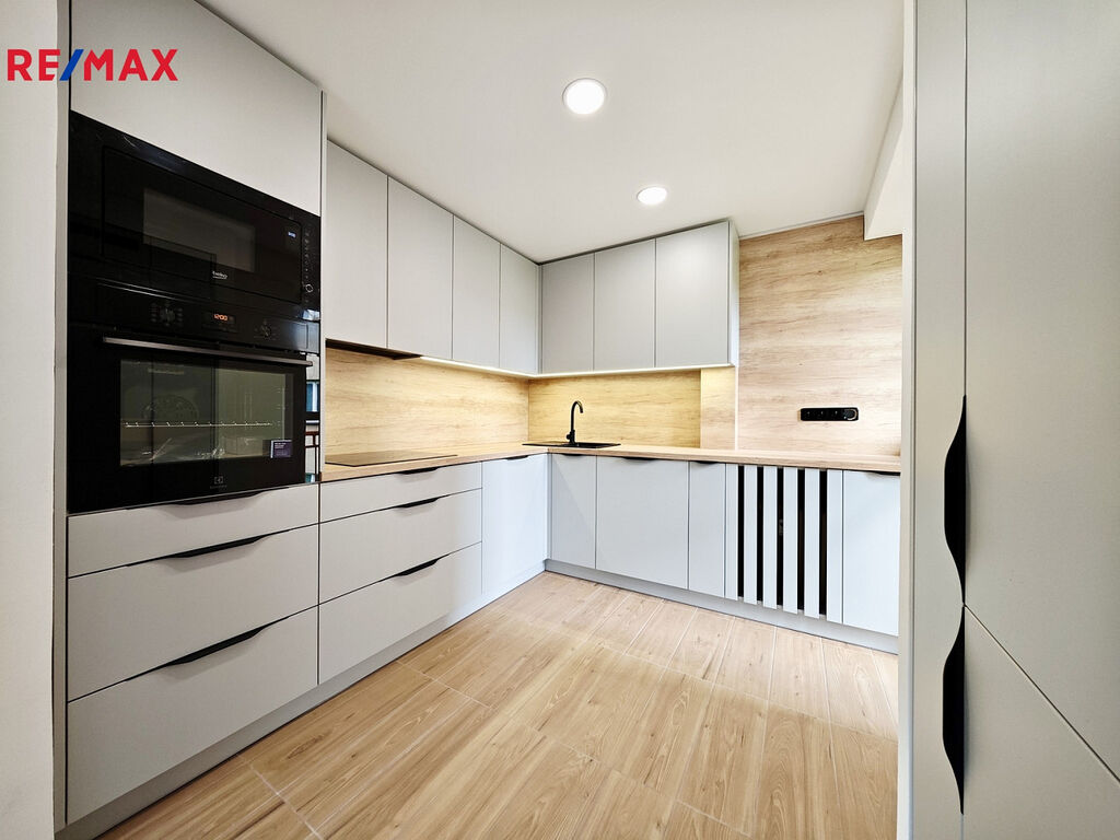 Vybavení bytu - kuchyňská linka s zabudovanou indukční deskou, horkovzdušnou troubou, mikrovlnou troubou, lednicí s mražákem a myčkou.