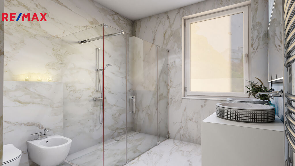 Samotný byt je zcela vyklizený a připravený k rekonstrukci podle vlastních představ. Náhledové fotografie s vybavením jsou vizualizace, aby si budoucí kupující dovedl lépe představit, co se do daného prostoru vejde nebo jak se dá zařídit. Velká okna a otevřený obývací prostor zajišťují dostatek denního světla a nabízí krásný výhled do zeleně i na okolní vilovou zástavbu.