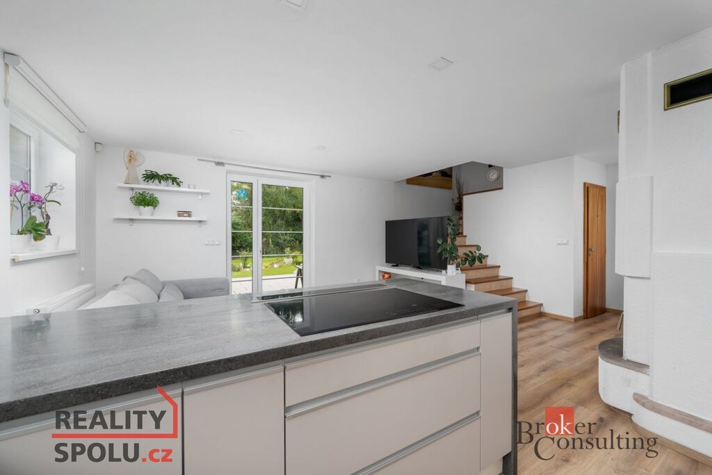 Dominantou domu je velkorysý, světlý obývací pokoj s krbem, plynule propojený s moderním kuchyňským koutem a přímým vstupem na terasu, kde si užijete posezení s výhledem do zeleně.