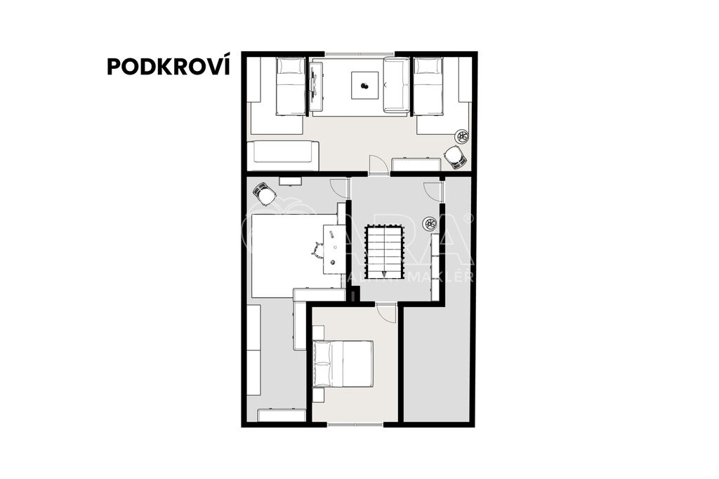 2. NP – vstupní hala, dvě prostorné ložnice, každá se vstupem na balkon, část půdního prostoru se využívá jako dílna (možnost vestavby dalšího pokoje, popř. příslušenství)