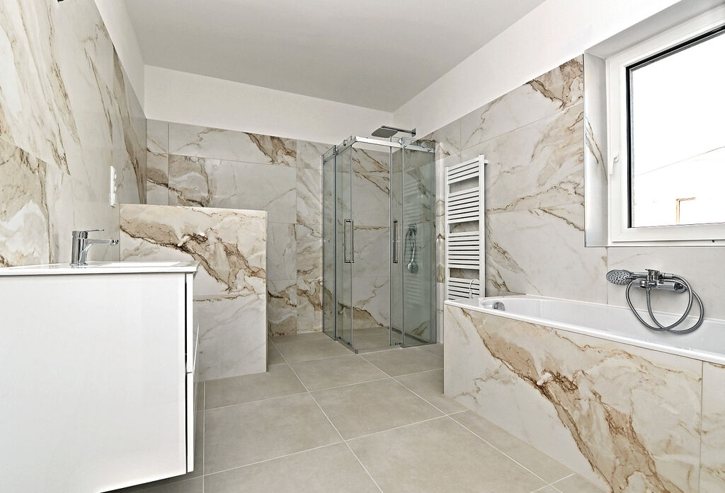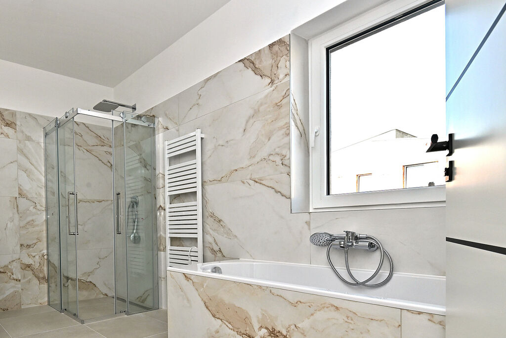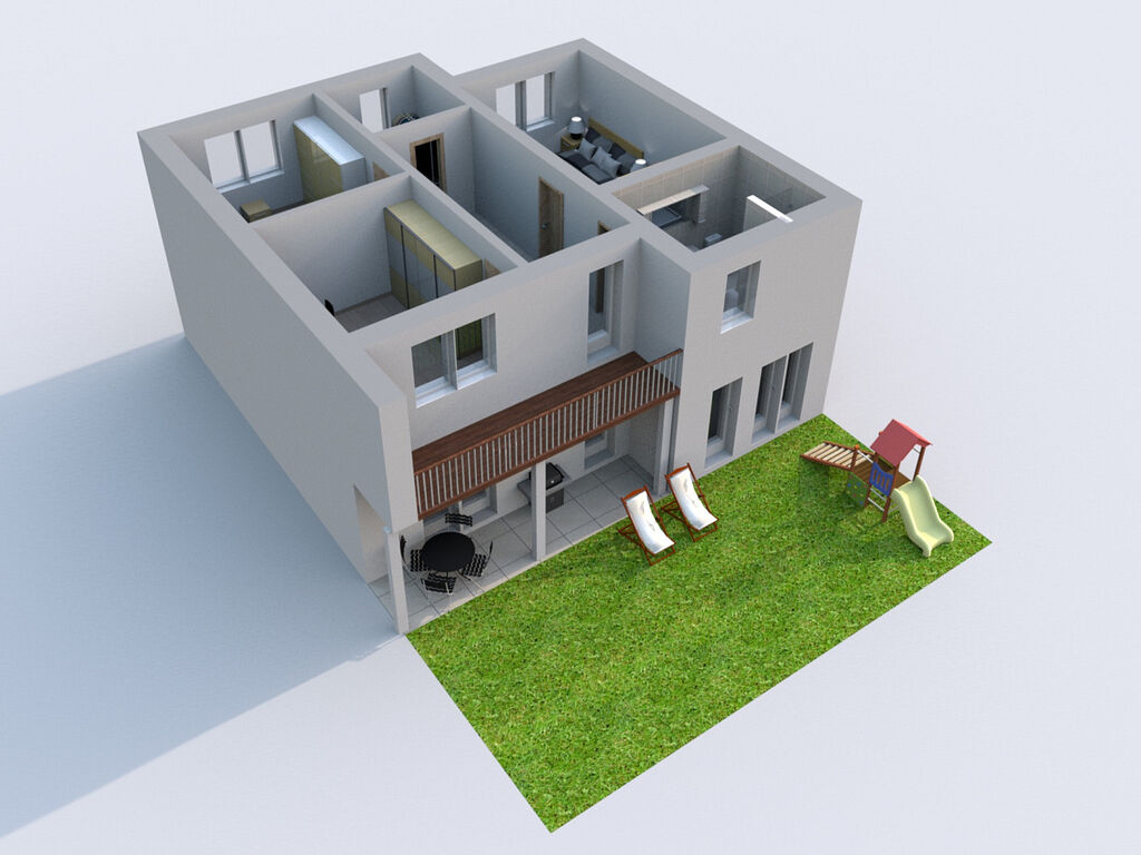Nízkoenergetický řadový dům o dispozicích 5+kk a garáží stojí na pozemku o ploše 260 m² a nabízí novým majitelům moderní komfortní bydlení v nově zbudované čtvrti.