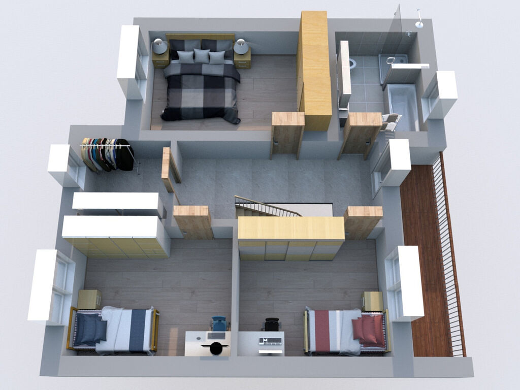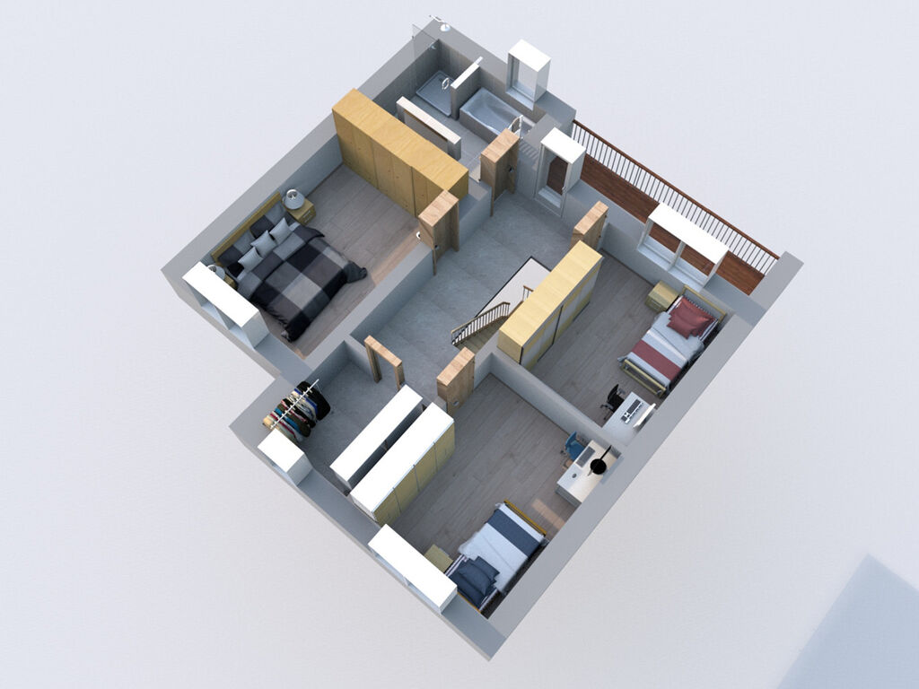 2. NP - chodba, 3 ložnice, šatna - pracovna, koupelna s WC