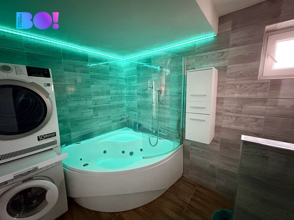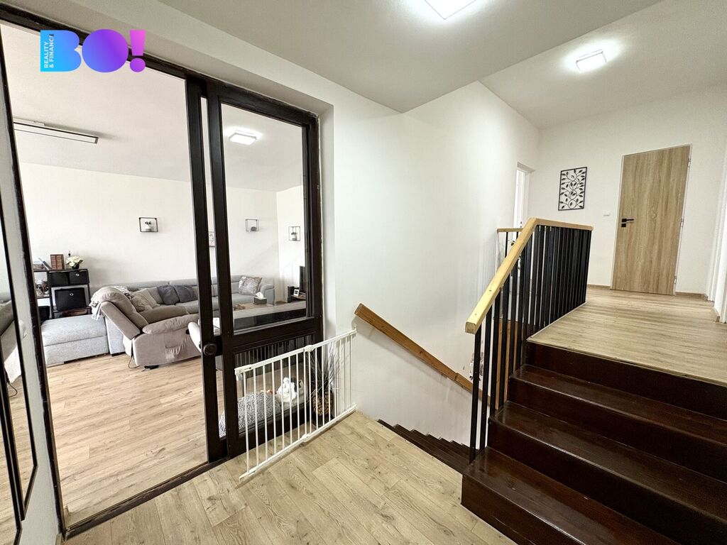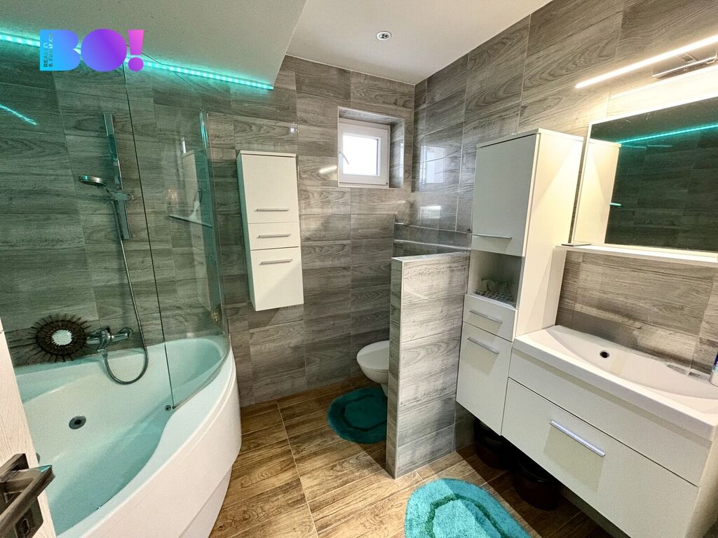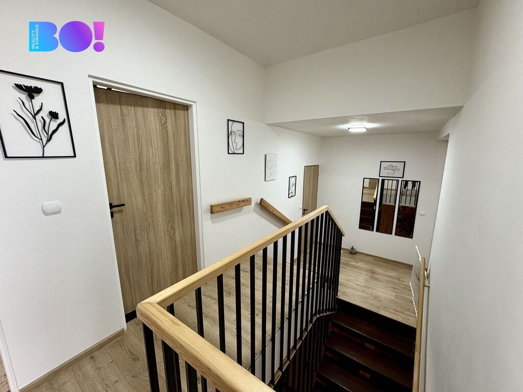 V přízemí najdete pracovnu se samostatným WC, ze které se vstupuje do bytové jednotky o dispozici 2+kk. Bytová jednotka zahrnuje kuchyni se vstupem na zahradu, obývací pokoj, ložnici a koupelnu s vanou a s WC. Z pracovny je také vstup do sklepa a do patra, kde se nachází druhá bytová jednotka o dispozici 3+kk. Ta nabízí velkorysý obývací pokoj s jídelnou a vstupem na balkon s krásným výhledem na okolí, dále je kuchyně se spíží, koupelna s vanou a WC, dětský pokoj, ložnice a šatna. Obě koupelny jsou vybaveny vanami s možností vířivky, což umocňuje ještě větší komfort.