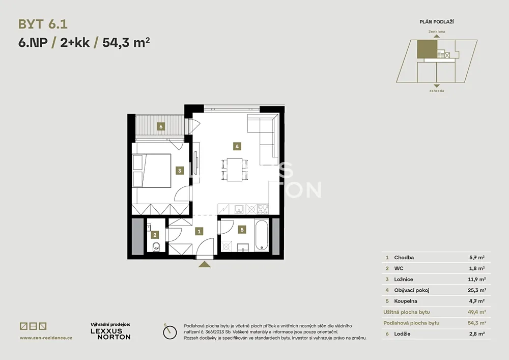 Nabízíme moderní byt 2+kk o celkové ploše 54,3 m², který se nachází v 6. nadzemním podlaží prestižního projektu ZEN Rezidence v pražské Libni. Tento byt s lodžií (2,8 m²) orientovanou na severní stranu a promyšlenou dispozicí nabízí ideální spojení pohodlí, funkčnosti a stylového bydlení v blízkosti centra města.