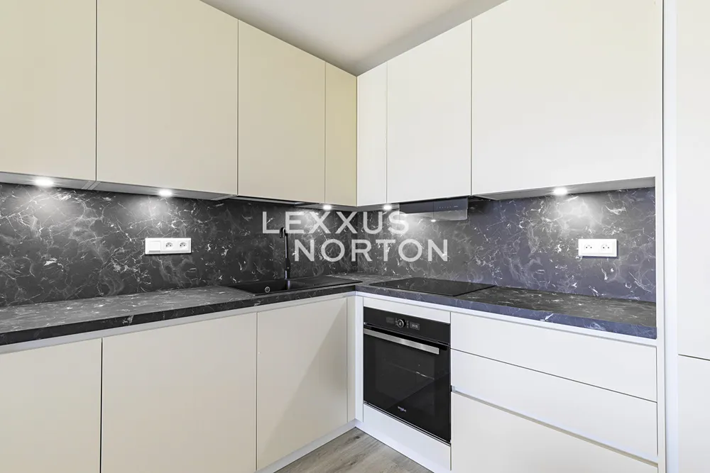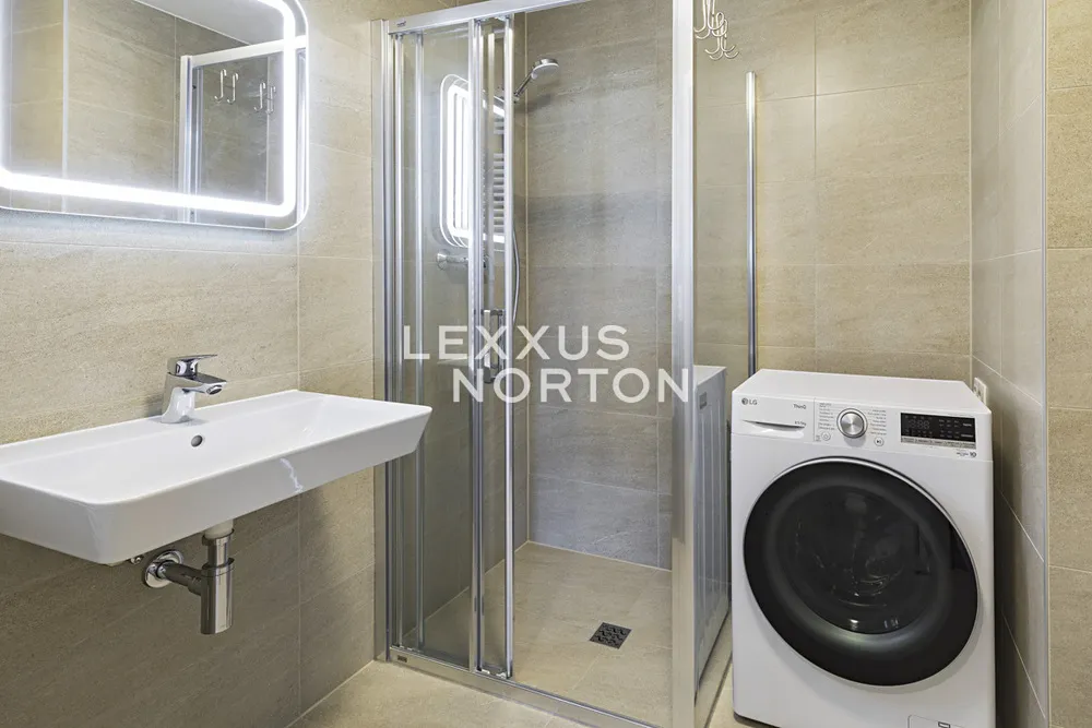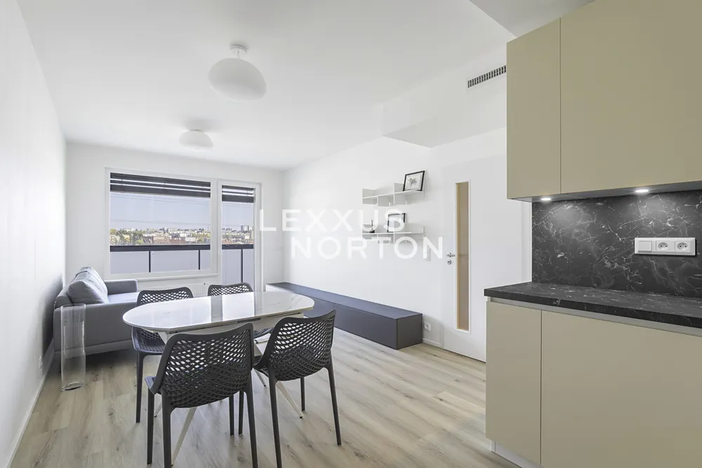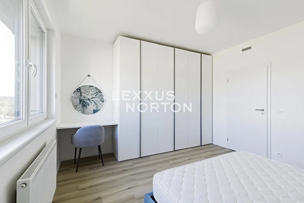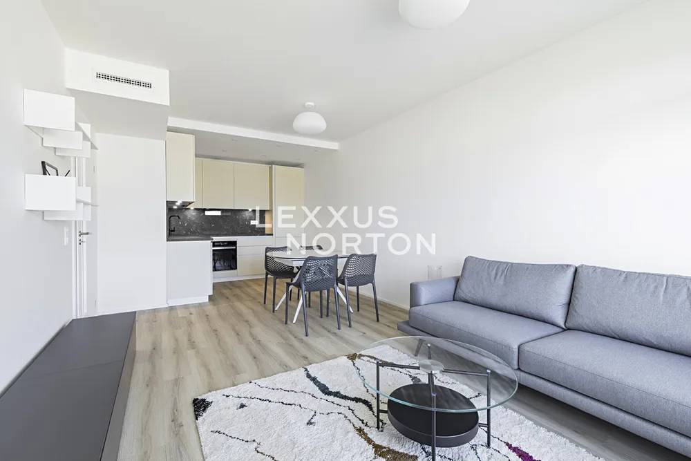 Tento světlý zařízený byt 2+kk k pronájmu nabízí k užívání vstupní chodbu, prostorný obývací pokoj, plně vybavenou kuchyni. Ložnice, koupelna (sprchový kout a toaleta). K bytu náleží prostorná lodžie, okna na celém bytě mají trojitá skla chránicí před hlukem. Celý byt spolu se zařízením je úplně nový a všechno bylo vybírané na míru s pomocí architekta. K bytu patří sklep, který se nachází na stejném patře přímo naproti výtahu a garážové stání. Součástí rezidenční budovy je místnost pro kočárky a další místnost pro mytí kol a psů.