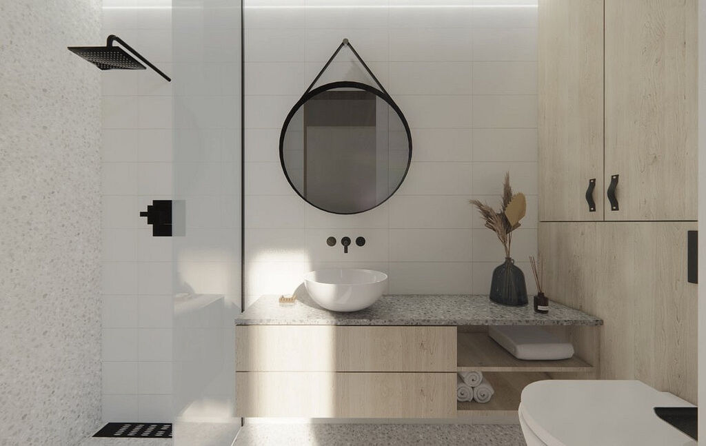 - Stylová koupelna je vybavena kvalitními materiály a velkoformátovými obklady