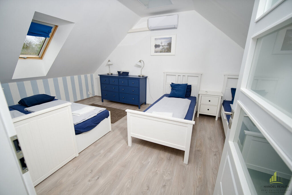 Apartmán disponuje světlým a vzdušným obývacím pokojem s rozkládací sedačkou, LCD televizí, Wi-Fi připojením a klimatizací. Kuchyňský kout je plně vybaven – k dispozici je varná deska, mikrovlnná trouba, lednice, myčka nádobí a kompletní nádobí pro pohodlné vaření. V přízemí se nachází ložnice s manželskou postelí, v podkroví pak dvě samostatná lůžka a jedno dvoulůžko, rovněž s klimatizací. Koupelna je vybavena sprchovým koutem, toaletou a pračkou. K apartmánu náleží také terasa s posezením a výhledem do zeleně a praktický uzamykatelný sklep, vhodný například pro uložení kol nebo kočárku.