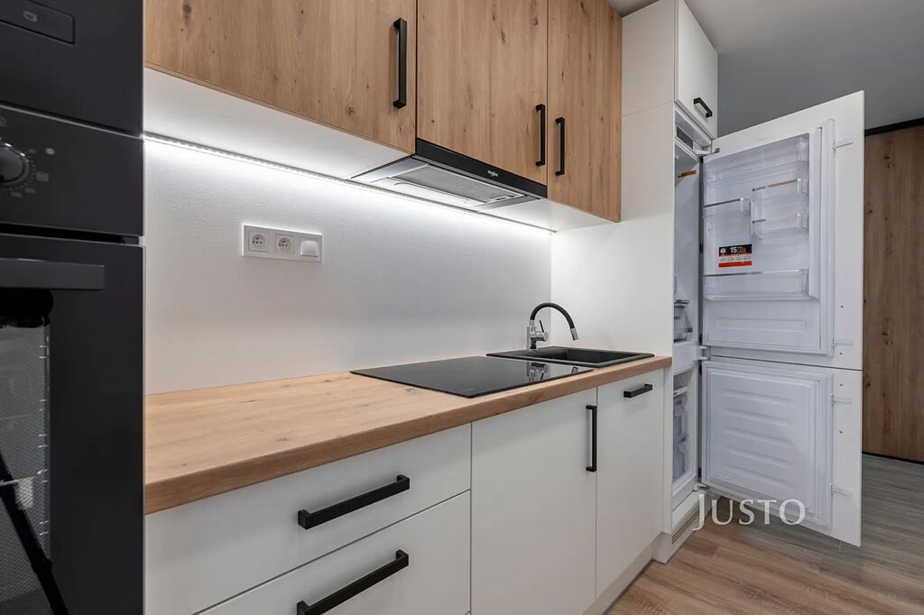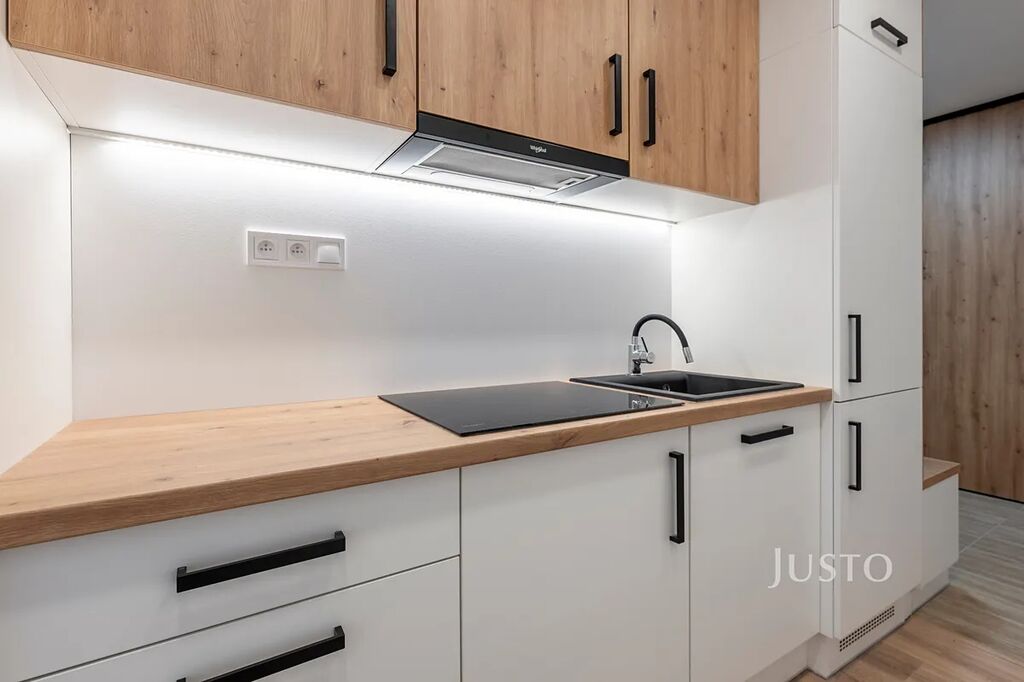 Byt je nezařízený, což novým nájemcům umožňuje zařídit si interiér dle vlastního vkusu. Kuchyně je moderně vybavena zabudovanými spotřebiči a dostatkem úložných skříněk, koupelna je vybavena sprchovým koutem a kvalitní sanitou.