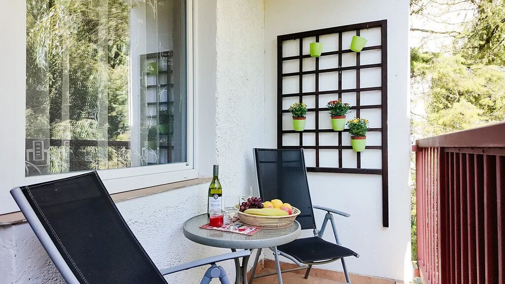 Lodžie je skvělým místem pro relaxaci s výhledem do okolní zeleně, ideální pro posezení s šálkem kávy nebo čtení.
