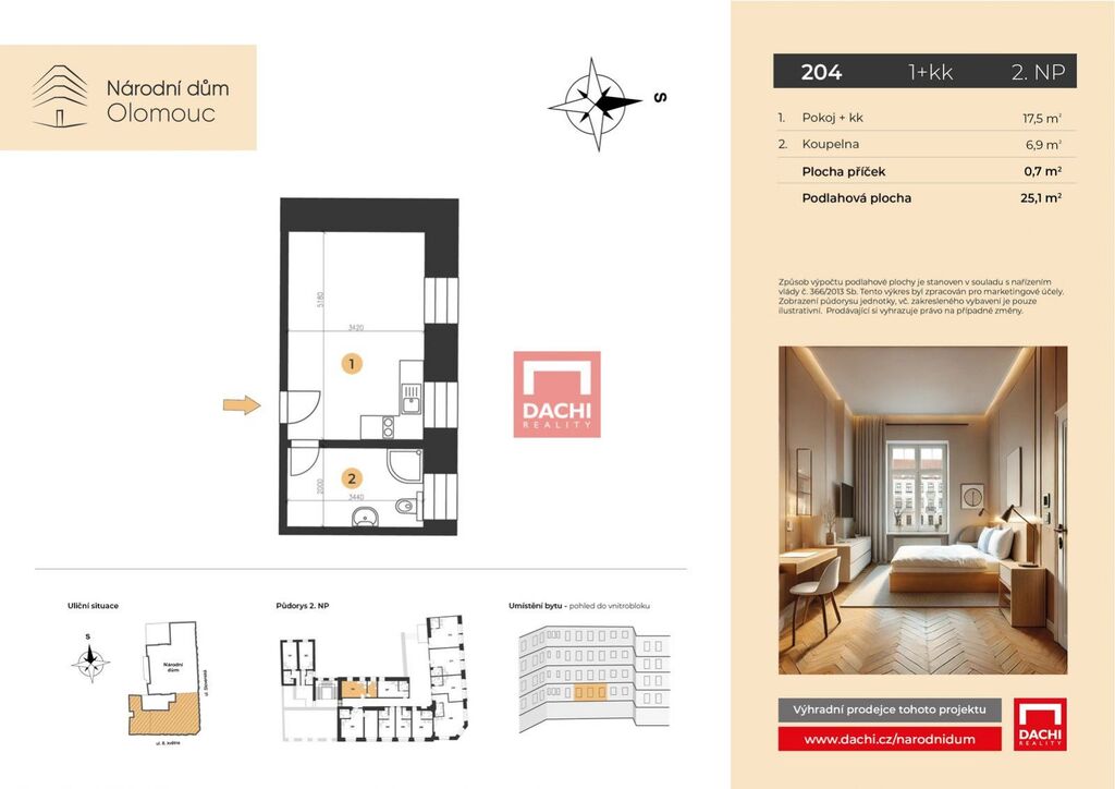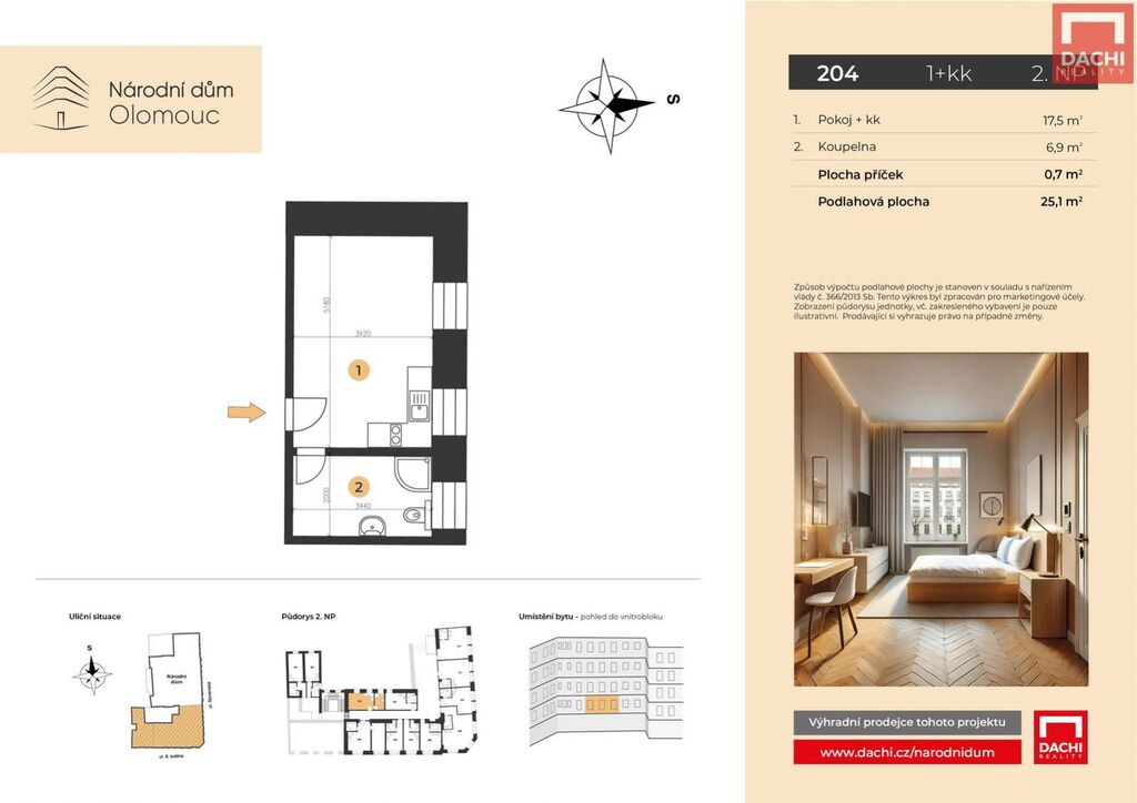 V rámci projektu nabízíme byt č. 204 o dispozici 1+kk s podlahovou plochou 25,1m, který se nachází ve 2. nadzemním podlaží.