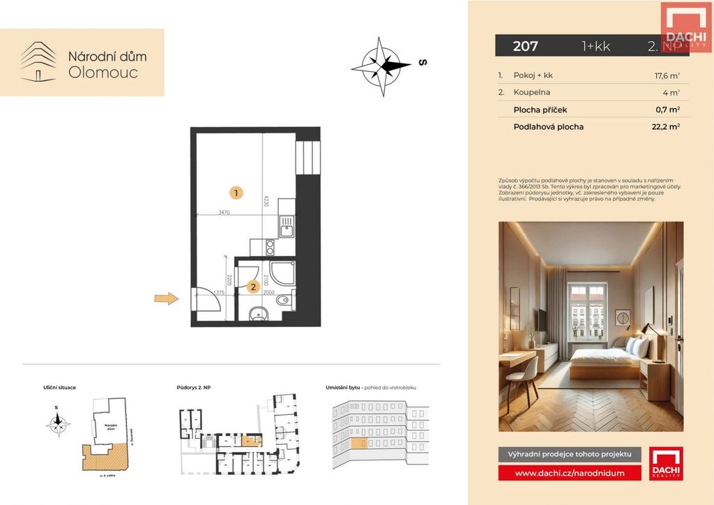 V rámci projektu nabízíme byt č. 207 o dispozici 1+kk s podlahovou plochou 22,2m, který se nachází ve 2. nadzemním podlaží.