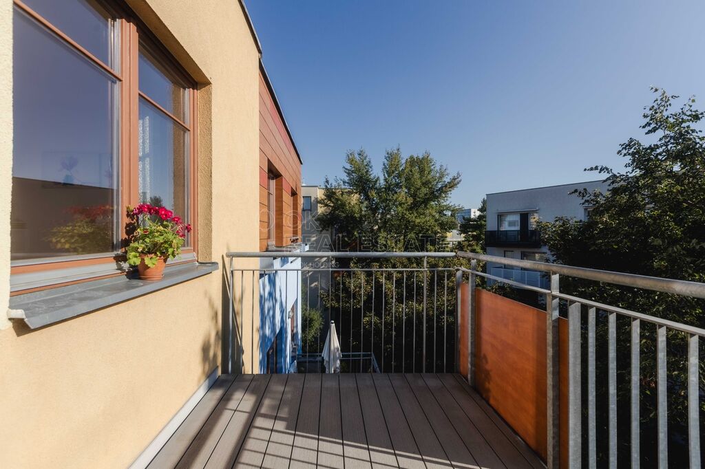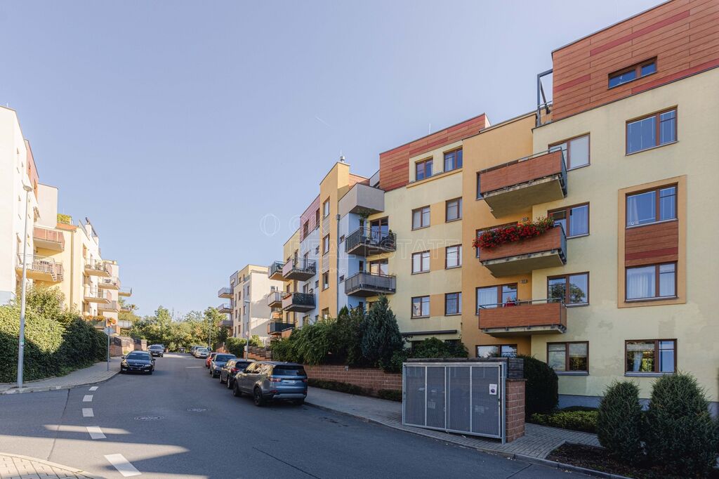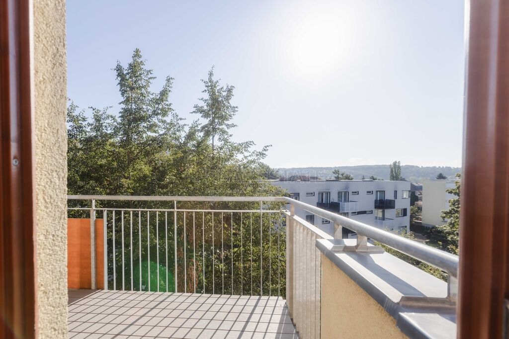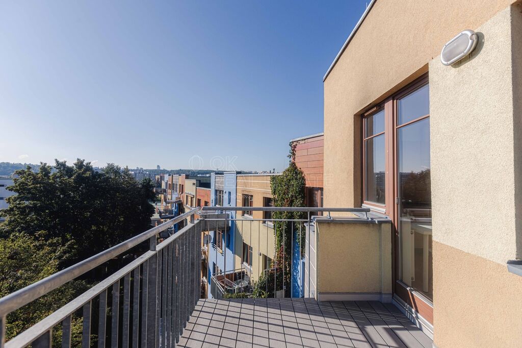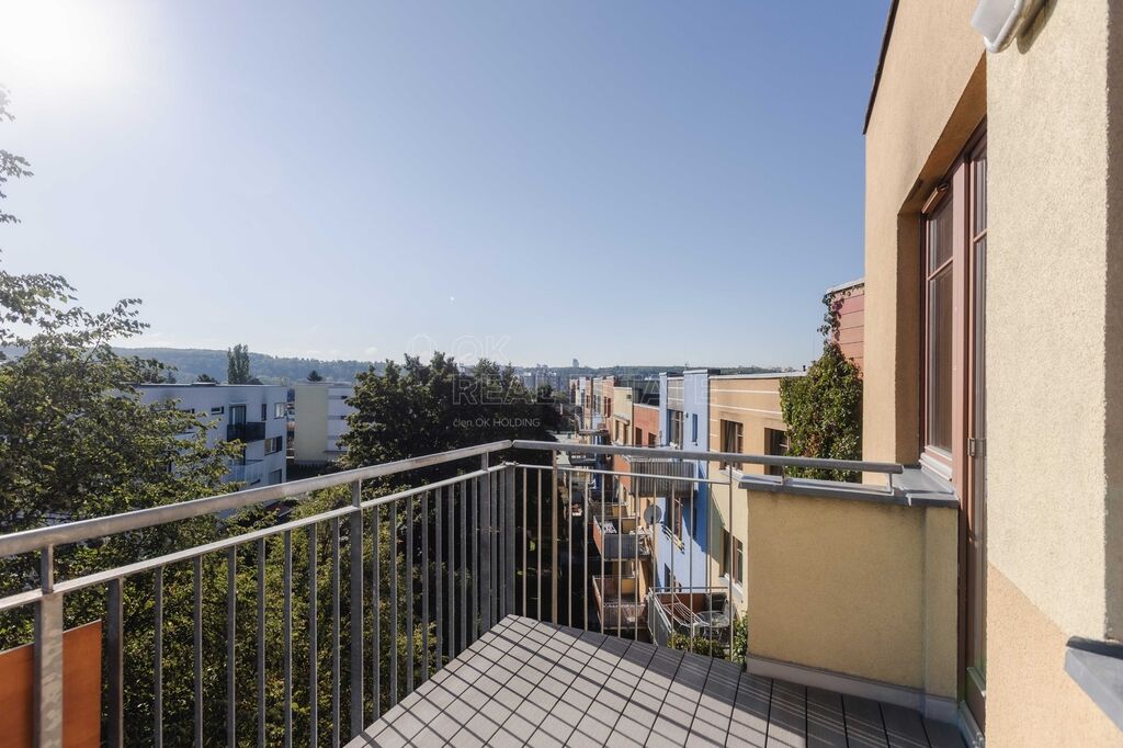 Prostorný balkon (6,4 m²) s působivým výhledem na panorama Prahy, ideální pro ranní kávu i večerní odpočinek.