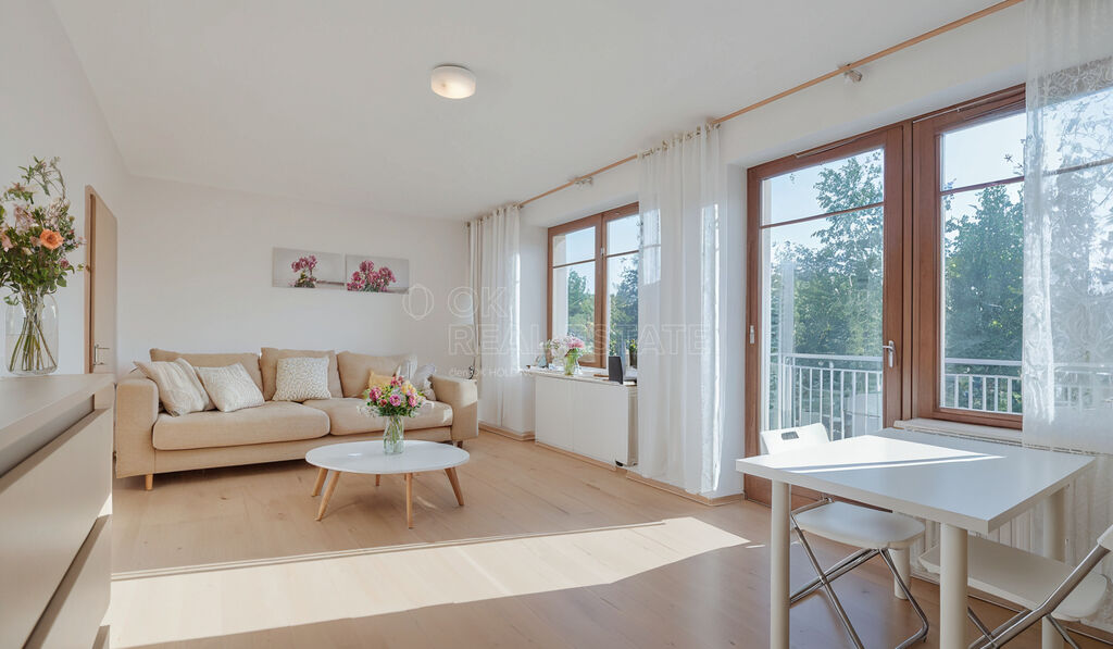 Prosvětlený obývací pokoj s plovoucí podlahou a vstupem na balkon.