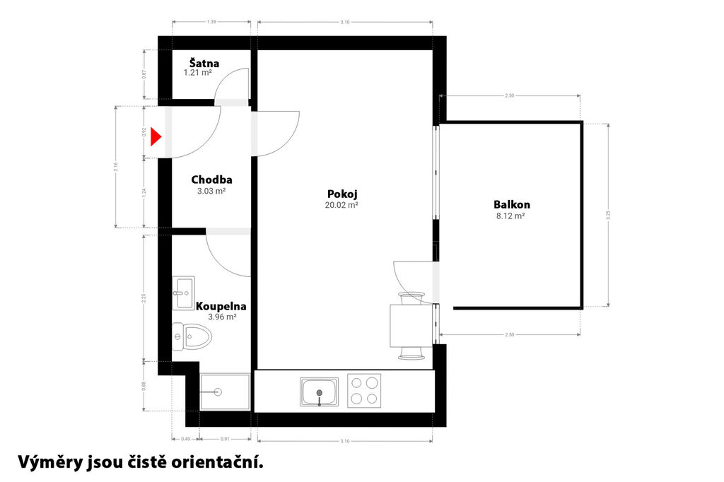 Dispozice: 1+kk + balkon + komora v bytě