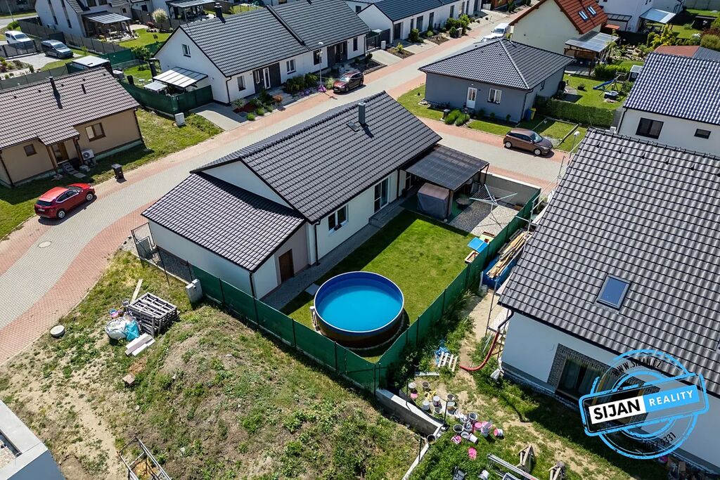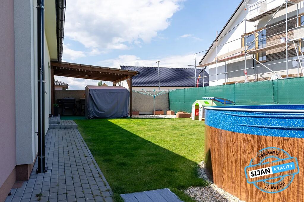 Na udržované zahradě si užijete soukromí i relax – k dispozici je bazén o objemu 20 m³, vyhřívaný tepelným čerpadlem umístěným v garáži. Prostorná terasa s pergolou vybízí k letnímu posezení a rodinným grilovačkám. Samozřejmostí je garáž (32 m²) s elektrickými vraty na dálkové ovládání.