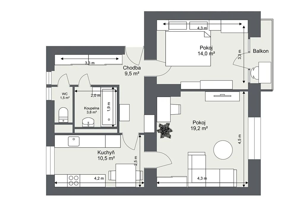dva samostatné pokoje: 19,2 m² a 14 m²