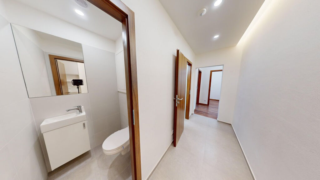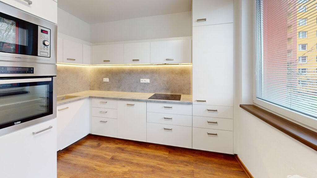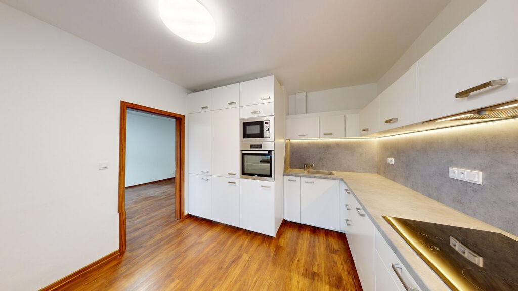 Jedná se o nezařízený byt, který zahrnuje sklepní kóji o velikosti 2,5 m2. Vybavení zahrnuje novou kuchyňskou linku se varnou deskou, myčkou, troubou, mikrovlnnou troubou a lednicí.