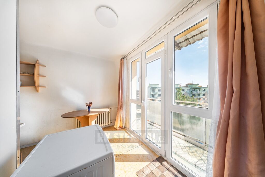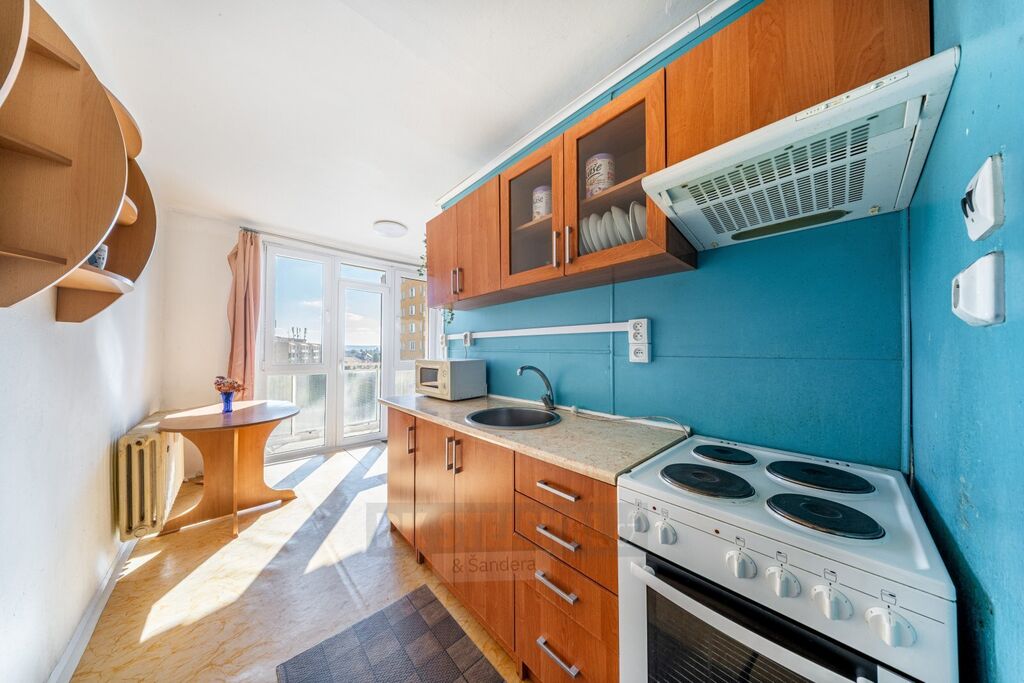 Srdcem bytu je světlá kuchyně s dostatkem místa pro jídelní kout. Dominantou je prosklená stěna vedoucí na balkon orientovaný na jih, který zajišťuje nejen skvělé prosvětlení interiéru, ale i příjemné ranní posezení s krásným výhledem. Za kuchyní se nachází koupelna s toaletou, chytře oddělená pro větší soukromí.