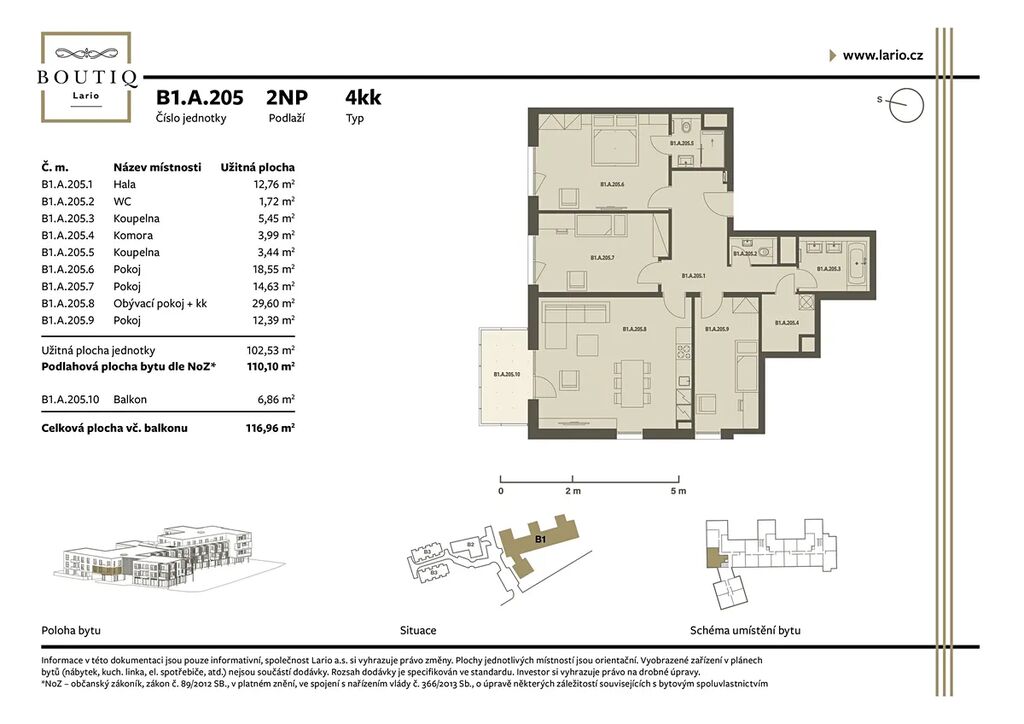 Nabízíme moderní byt o dispozici 4+kk v novém rezidenčním projektu LARIO s energetickou třídou A, který realizuje česká developerská skupina BOUTIQ. Projekt spojuje moderní architekturu, vysoký standard provedení a šetrný přístup k životnímu prostředí.