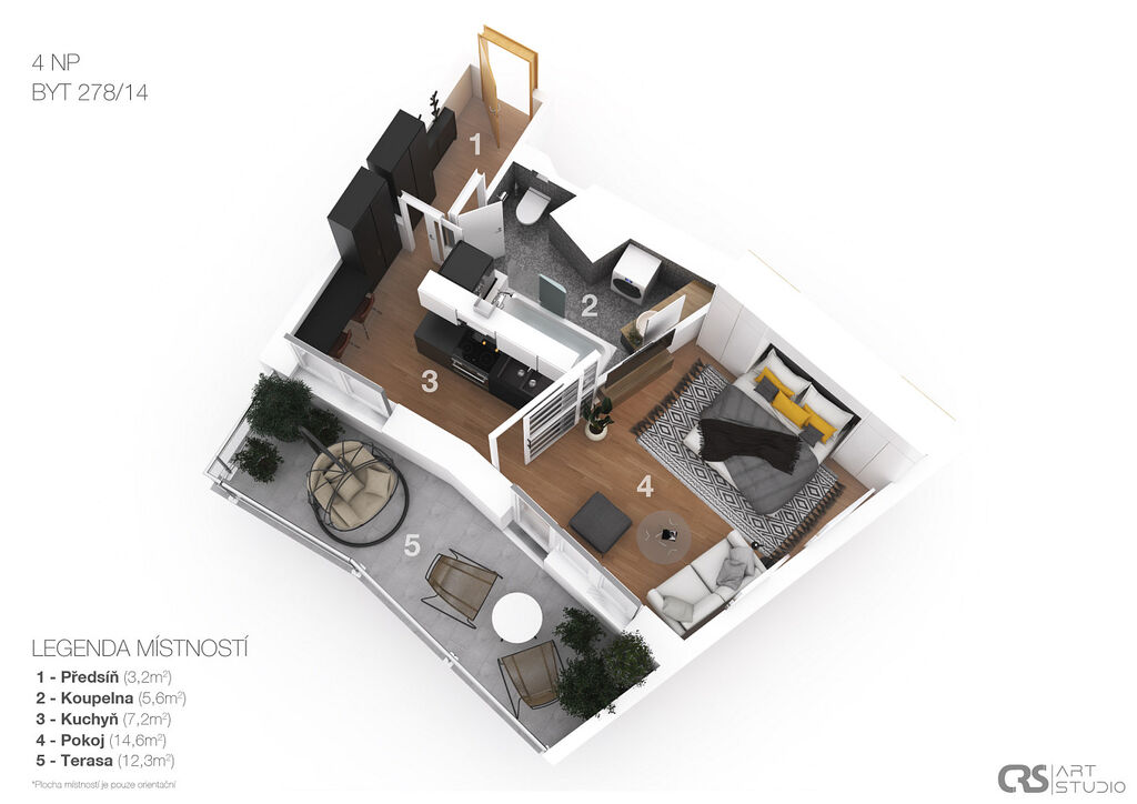 -Plocha: 46,72 m², včetne terasa: 12,27 m² (prostorná, ideální na relax)