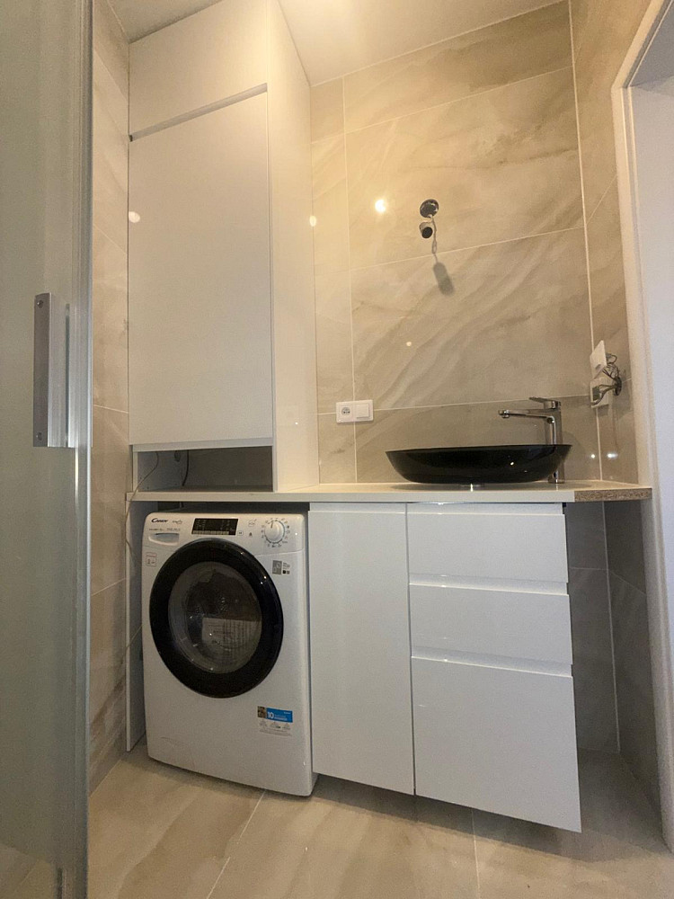 moderní kuchyně IKEA: myčka, pračka, lednice s mrazákem, sporák, mikrovlnná trouba