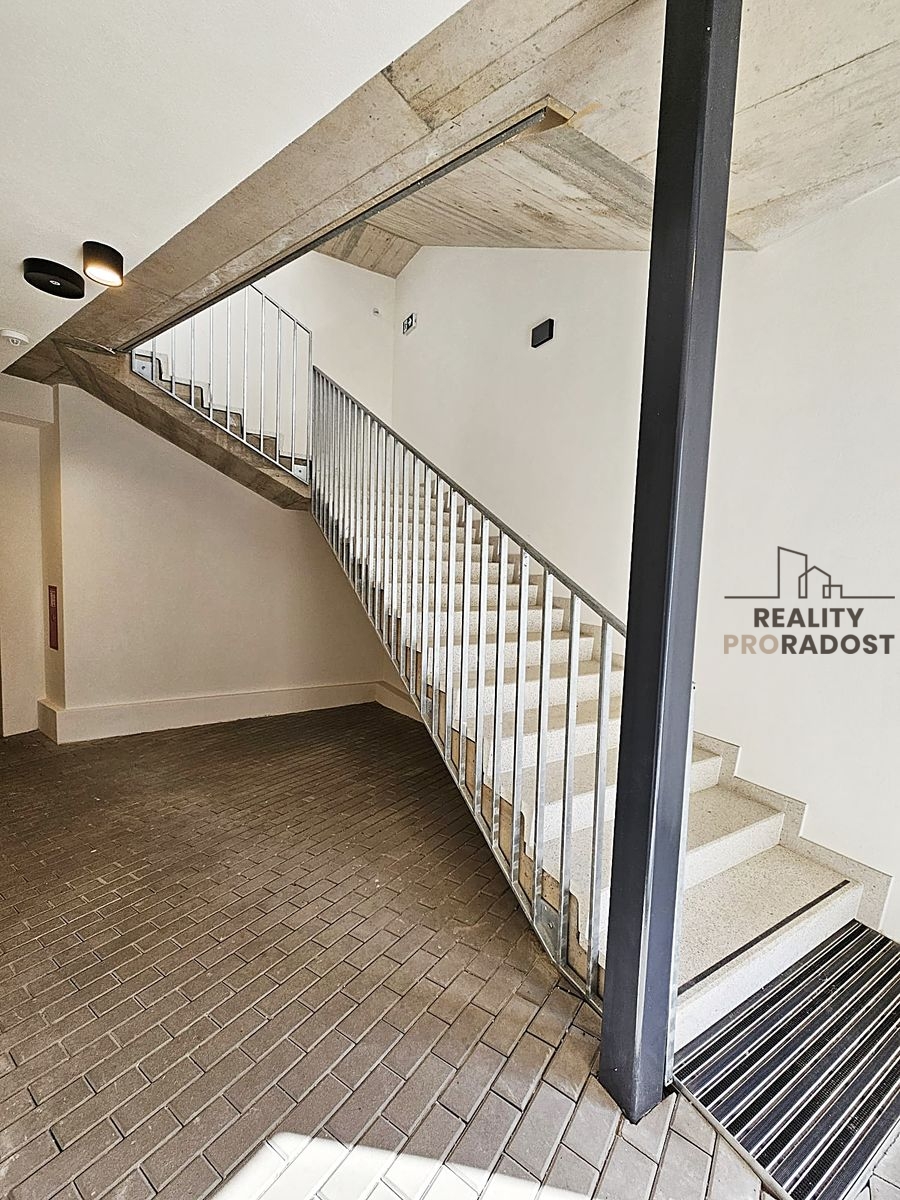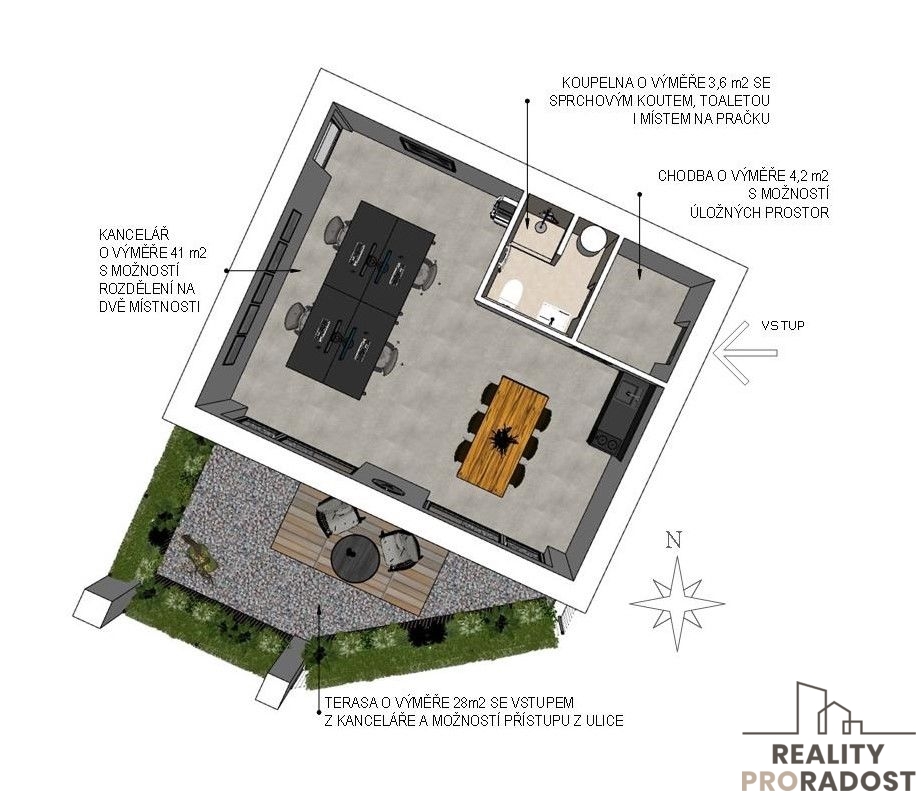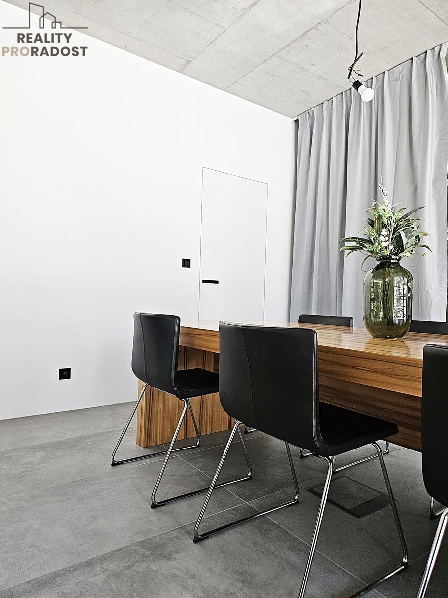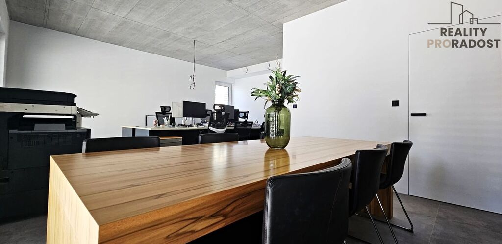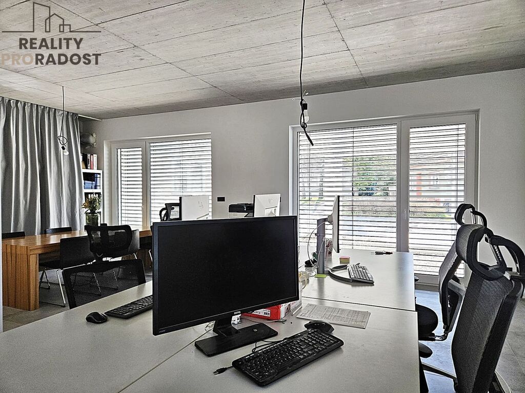 K dispozici je kancelář o výměre 40 m2 s možností přepažení na dvě místnosti, koupelna s prostorným sprchovým koutem, toaletou, umyvadlem a možností připojení pračky nebo myčky nádobí a vstupní chodba s možností vybudování úložných prostor. V celém prostoru je na podlaze keramická dlažba v dekoru imitace betonu s podlahovým elektrickým vytápěním. Přijemný detail kanceláře tvoři přiznané betonové stropy. Ohřev vody boilerem, rekuperace vzduchu. V kanceláři je kuchyňský kout. K přístupu na zastřešenou venkovní terasu slouží dvě francouzská okna v prostoru kanceláře. Při přepažení prostoru na dvě místnosti by byl zachován vstup na terasu z obou místností. Na všech oknech předokenní rolety.