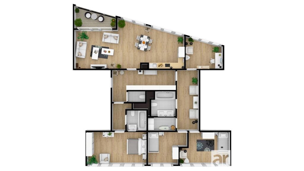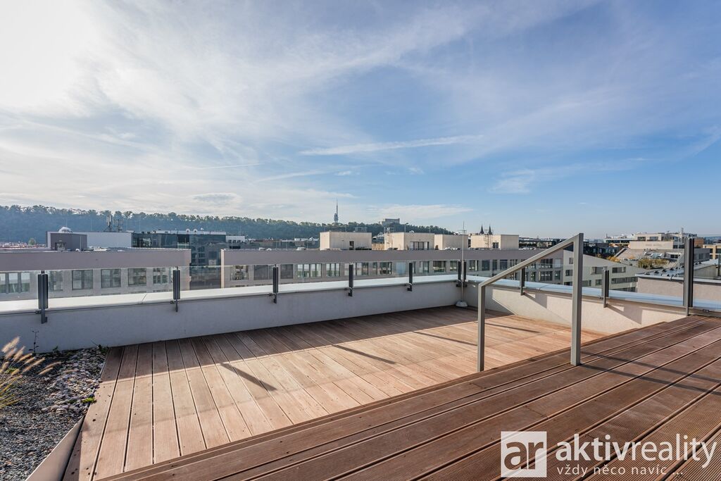 Dále jsou zde dvě prostorné chodby s vestavěnou skříní, čtyři pokoje, dvě koupelny s vanou a toaletou, samostatná toaleta s umyvadlem, technická místnost. Možnost pronajmout další garážové stání za poplatek. V 8. patře je společná terasa a k dispozici je recepce.