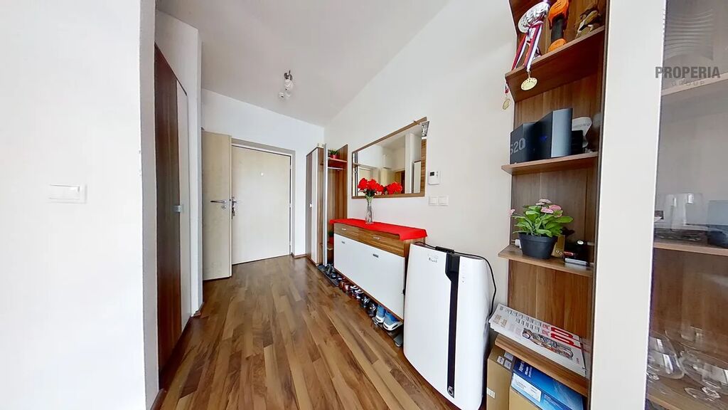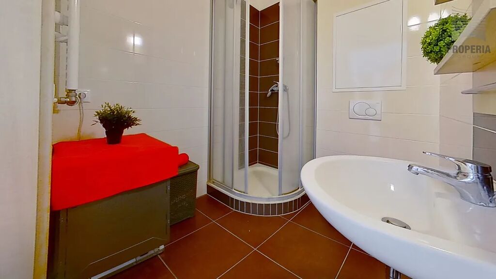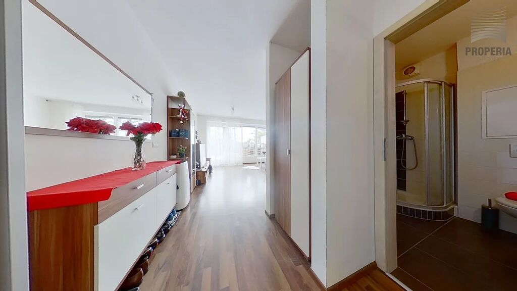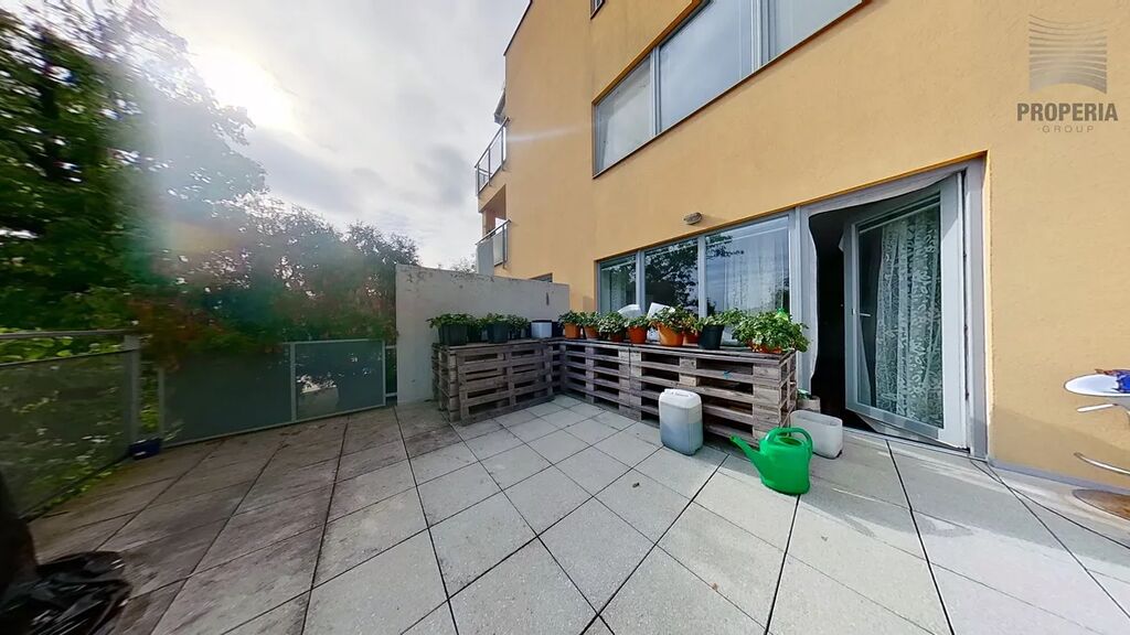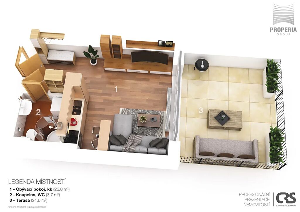 Byt nabízí obývací pokoj s kuchyňským koutem o velikosti 25,8 m², kde najdete praktickou kuchyňskou linku s moderními spotřebiči, dostatek úložných prostor, pohodlnou sedací soupravu a obývací stěnu. Koupelna s WC o velikosti 3,7 m² je vybavena sprchovým koutem, toaletou a umyvadlem v moderním designu. Skutečným lákadlem je terasa o ploše 24,6 m², která poslouží jako druhý obývák na čerstvém vzduchu – perfektní místo na relax, grilování s přáteli nebo ranní kávu.