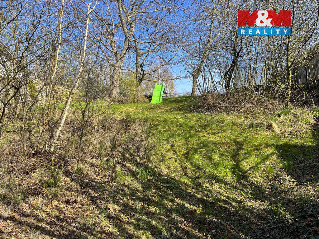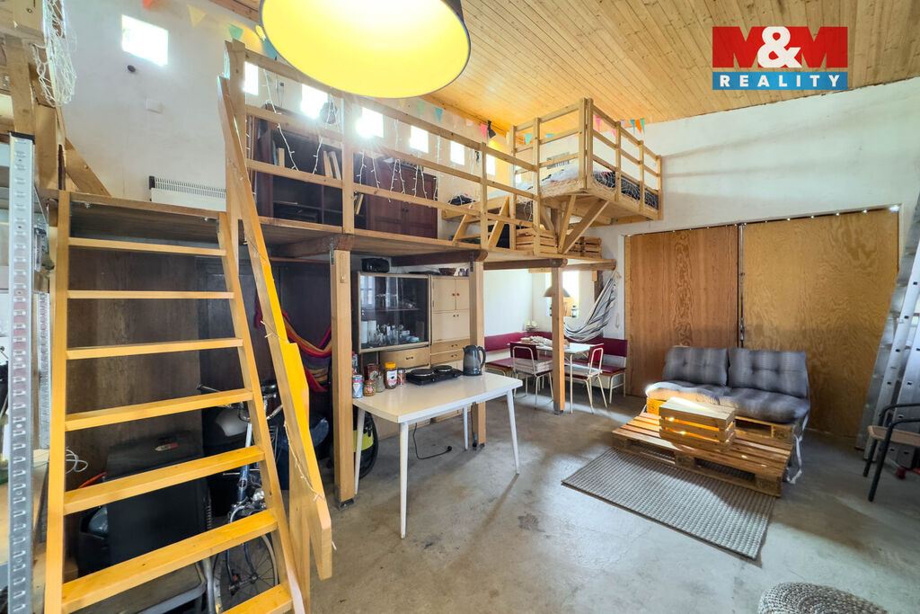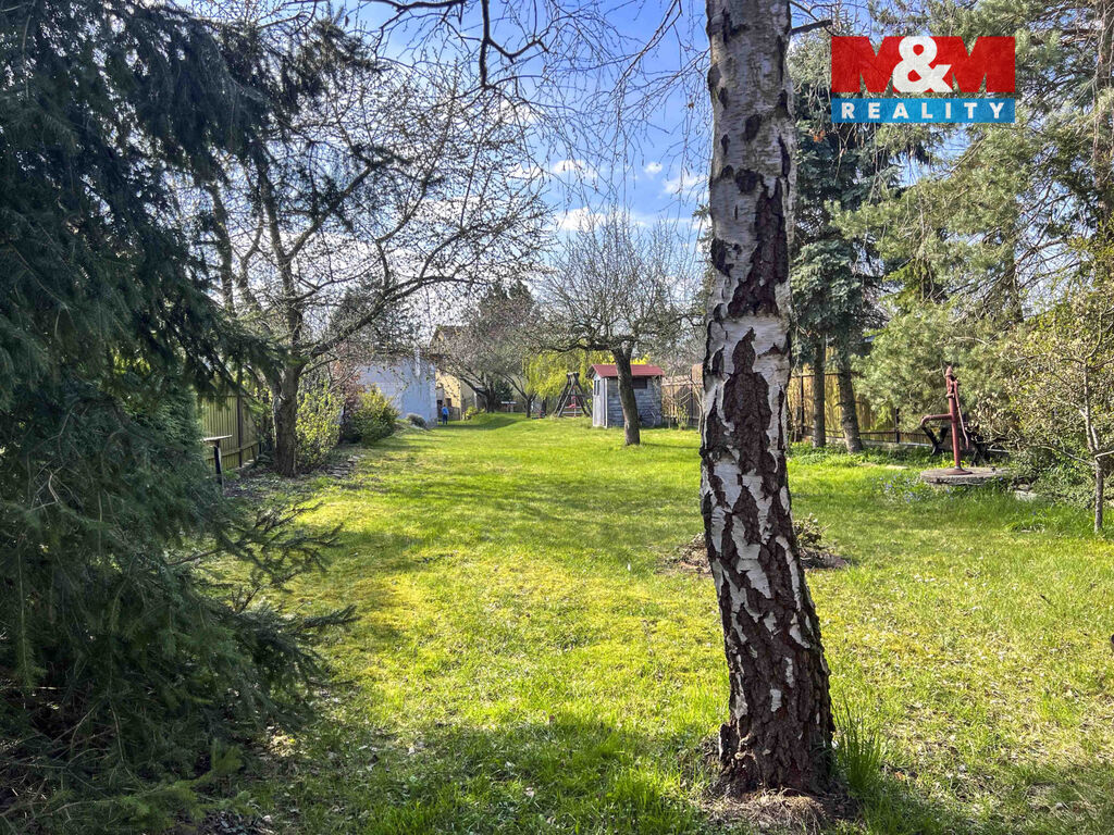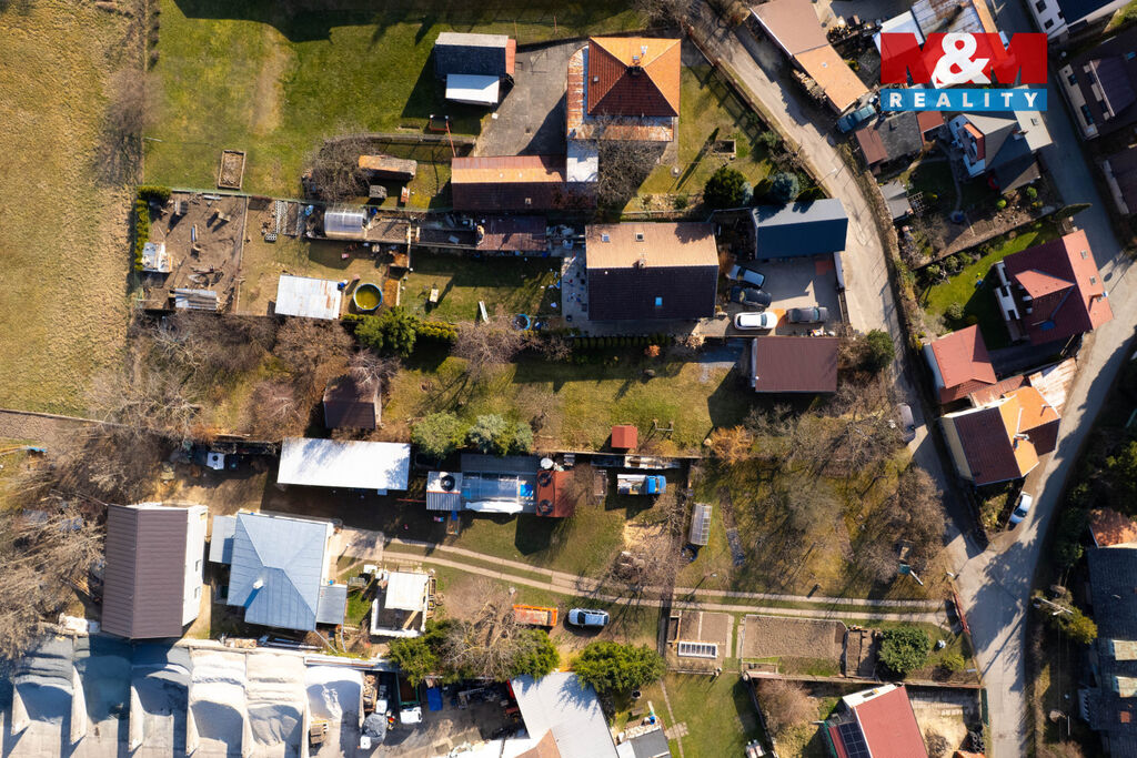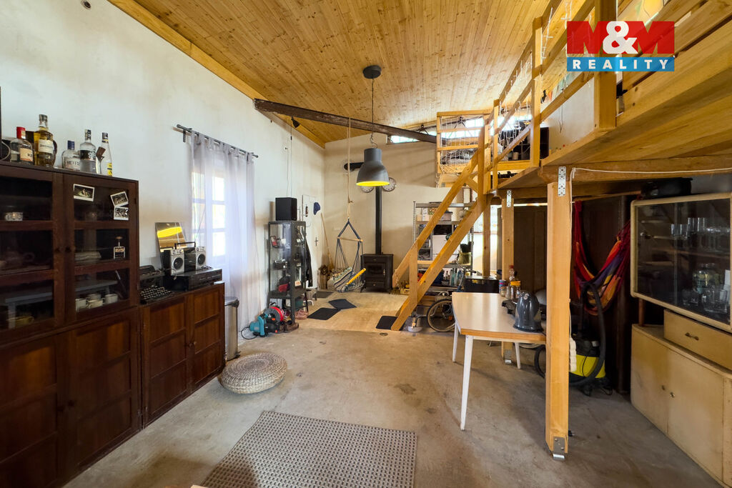 Součástí pozemku je zděná stavba (42 m²), která slouží jako víkendový domek s dřevěným patrem, zavedenou vodou a vytápěním kamny – ideální jako dočasné bydlení během stavby či jako rekreační objekt. Nechybí ani praktický dřevěný domek pro uskladnění materiálu v zadní části a malá kůlna.