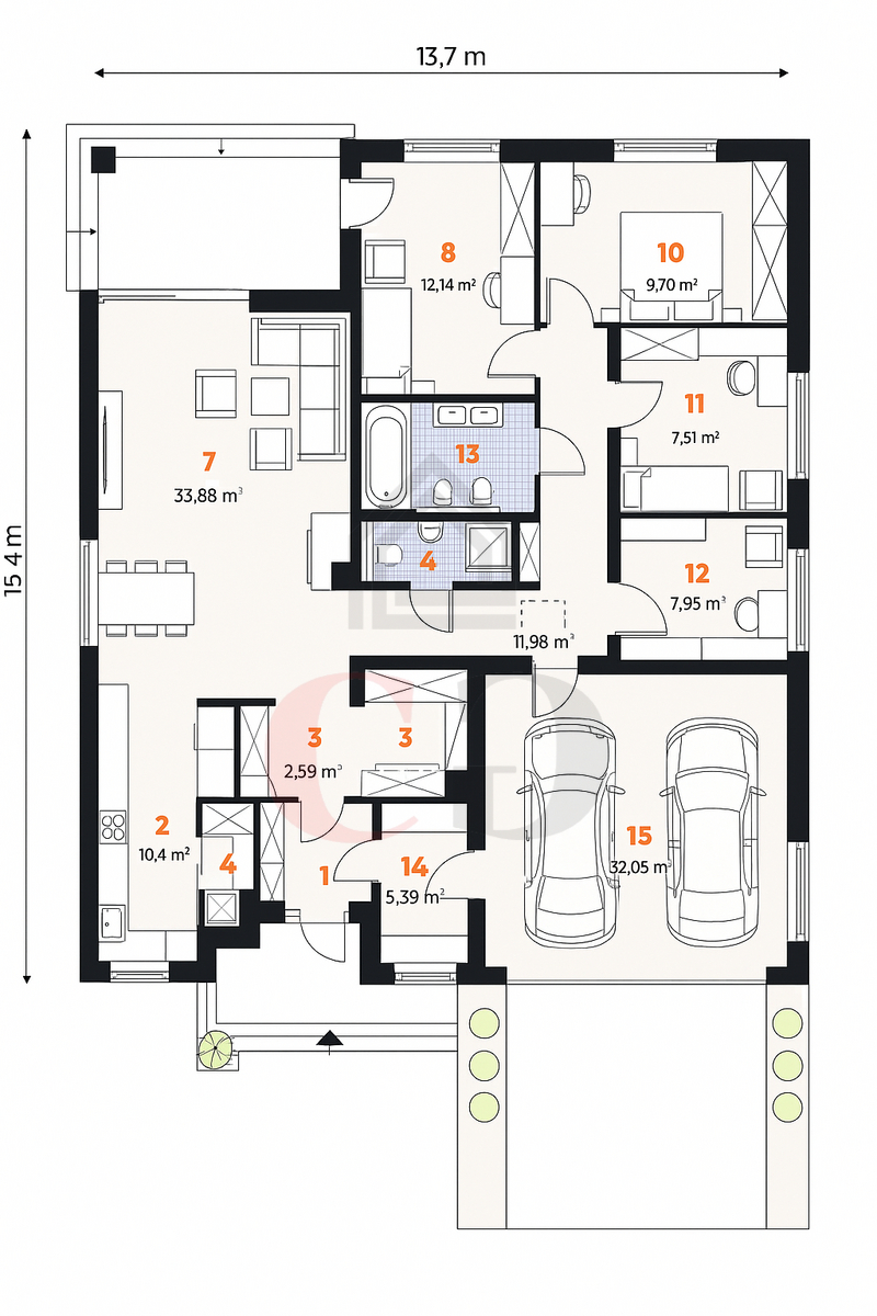 Projekt představuje elegantní bungalov s garáží pro dva automobily, postavený z kvalitních materiálů a navržený s důrazem na funkčnost i moderní design.