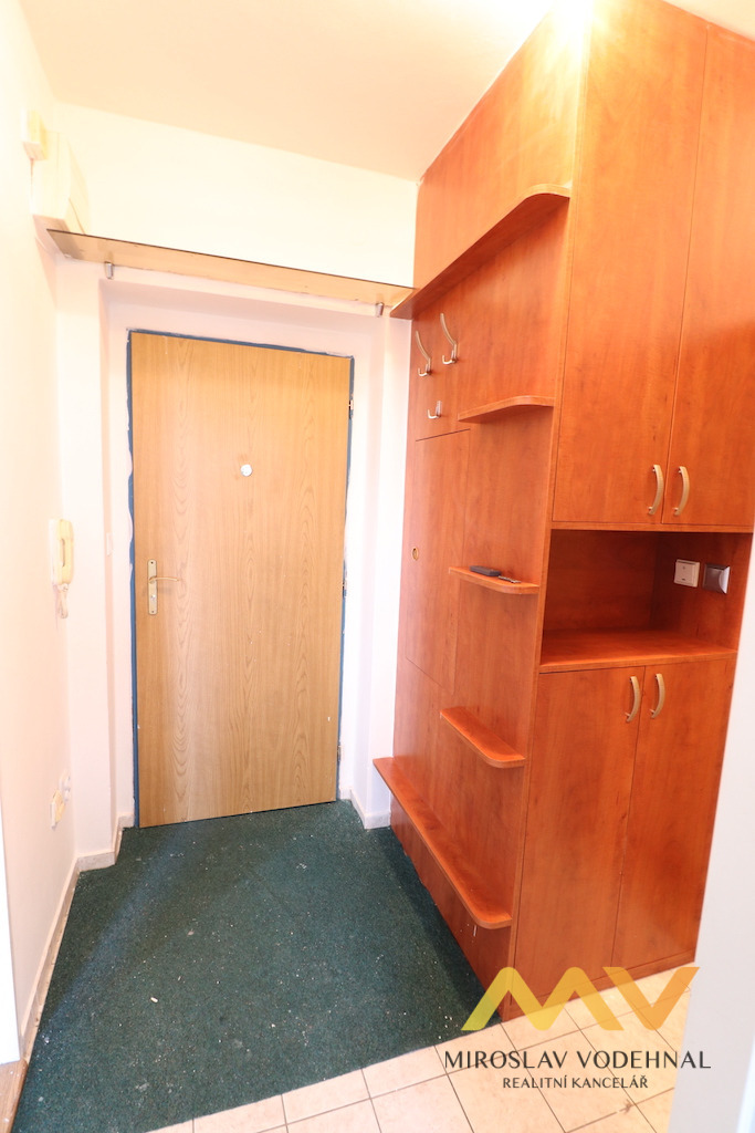 Obývací pokoj je vybaven vestavnou šatní skříní a obývací stěnou, kuchyňský kout disponuje linkou s elektrickým sporákem, digestoří a mikrovlnnou troubou (s možností instalace myčky). Ložnice je nezařízená. V koupelně je vana, toaleta, koupelnová skříňka se zrcadlem a přípojka na pračku. V předsíni se nachází vestavná skříň s botníkem. K bytu náleží komora na chodbě a k dispozici je také sušárna.