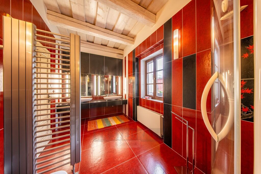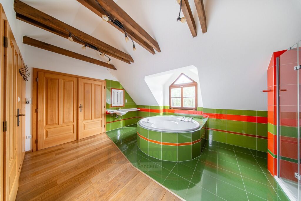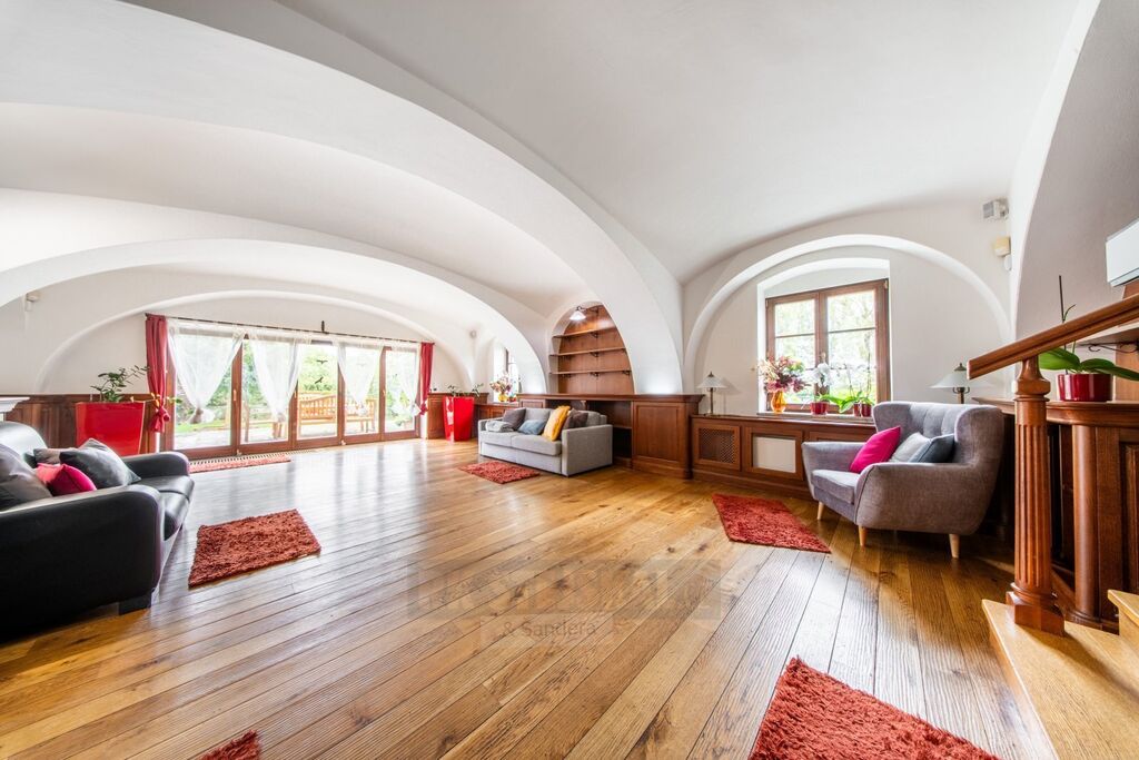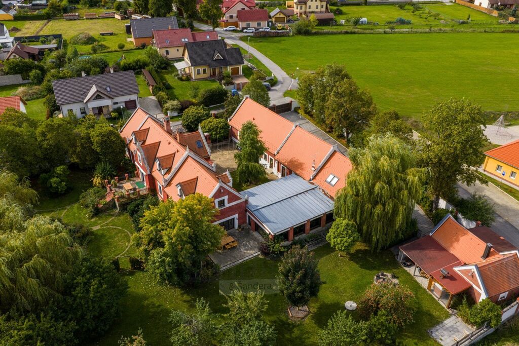 Hlavní stavba - rozlehlá rezidence do U s vnitřním nádvořím, garáže, hostinský byt, technická místnost, kancelář, archiv, serverovna, sociál a kuch. zázemí pro kancelář, bazénová místnost, wellness se saunou a kompletním zázemím, průchozí do RD přízemní části hlavní stavby, kde je obývací pokoj, kuchyňská místnost s jídelním prostorem, prosklení a vstupy do zahrady a na terasy, šatna, koupelna, komory a WC, ložnice, prostorné zádveří pro hlavní vstup do RD části z nádvoří, vstup do suterénu, hala se schodištěm do patra, v patře vstupní místnost vhodná jako průchozí obývací pokoj, zrcadlově pak dvakrát šatna s koupelnou, samostatná WC a prostorné ložnice, v suterénu domu pak dvě vinotéky a hodovna, dále pak sklepní místnost a samostatné WC,
