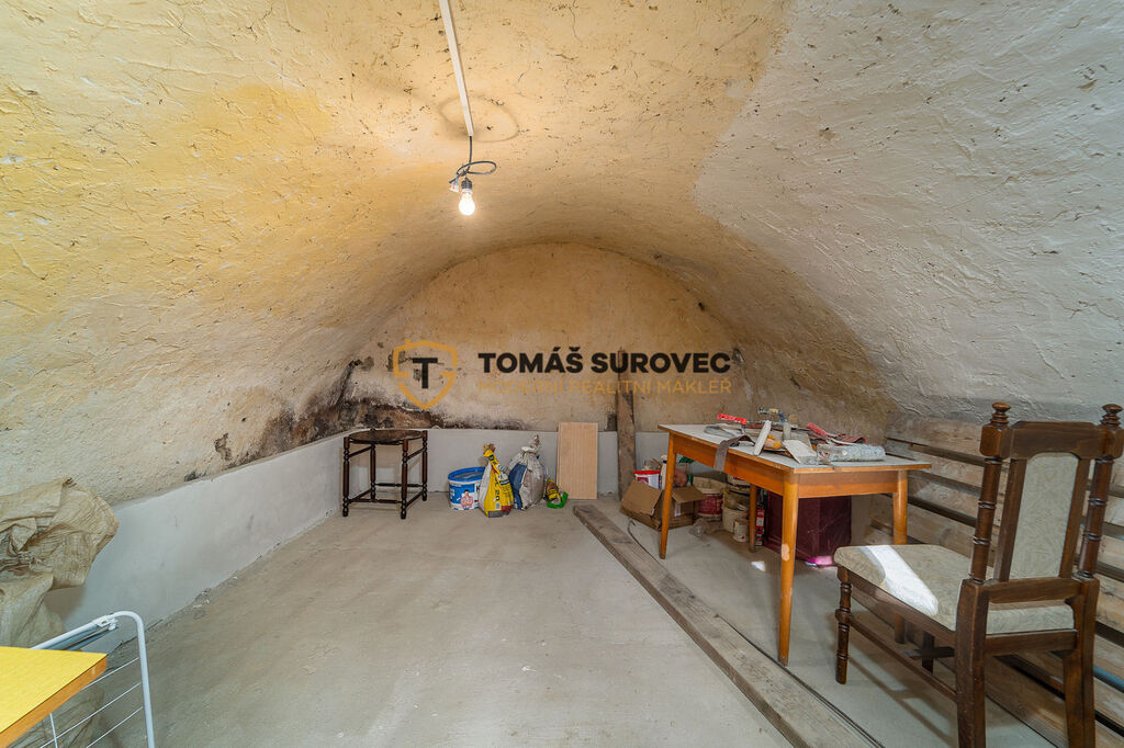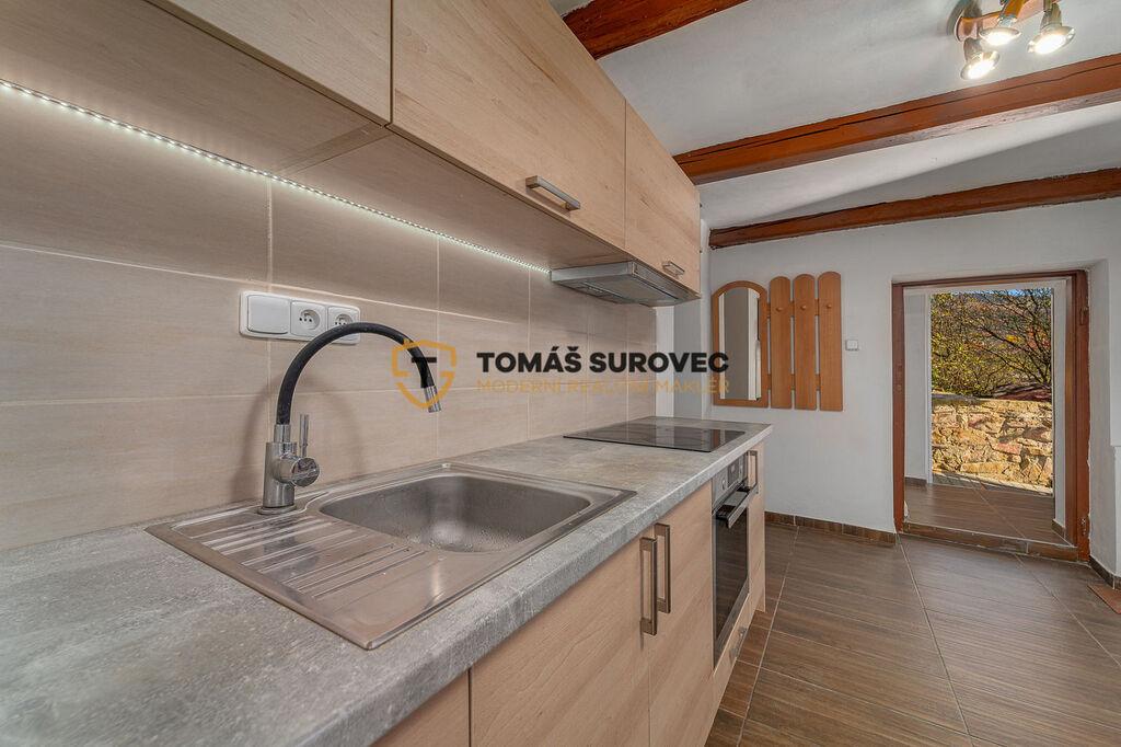 U vstupních dveří se na jedné straně nachází samostatné WC a na druhé straně koupelna. Srdcem domku je vybavená kuchyň se zánovní, moderní kuchyňskou linkou, dřevěným jídelním stolem a židlemi. Na stropě zaujmou dekorativní dřevěné rámy, navozující tradiční atmosféru. Průchozí je vstup do největší místnosti, částečně vybavené obývací části s krbovými kamny. Z kuchyně vedou dveře do neprůchozí ložnice. Ve všech místnostech jsou instalovány elektrické přímotopy.
