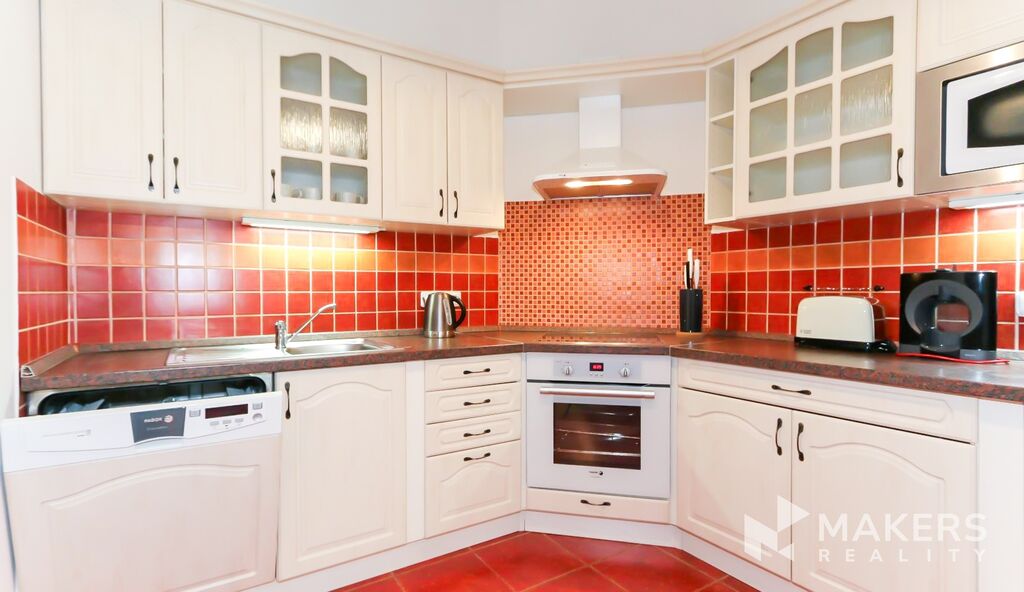 Interiér tvoří krásný světlý obývací pokoj s vybavenou kuchyní (lednice, myčka, varná deska, trouba, mikrovlnka). Dále jsou dvě samostatné romantické ložnice s manželskými postelemi a nočními stolky. V koupelně je vana a pračka. Toaleta je samostatná. Na podlahách jsou dřevěné plovoucí podlahy a dlažba.