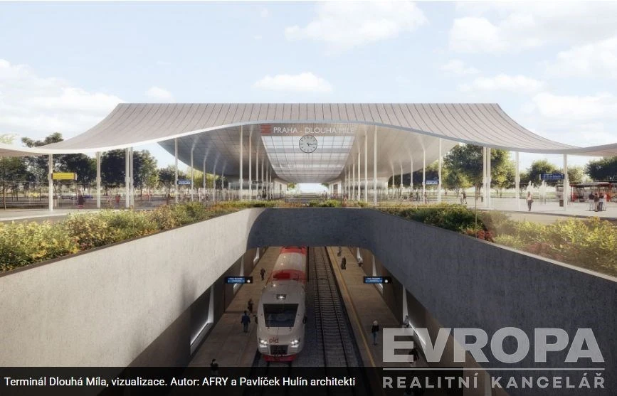 5 minut od budoucí vlakové stanice do centra a i na letiště Dlouha Míle.