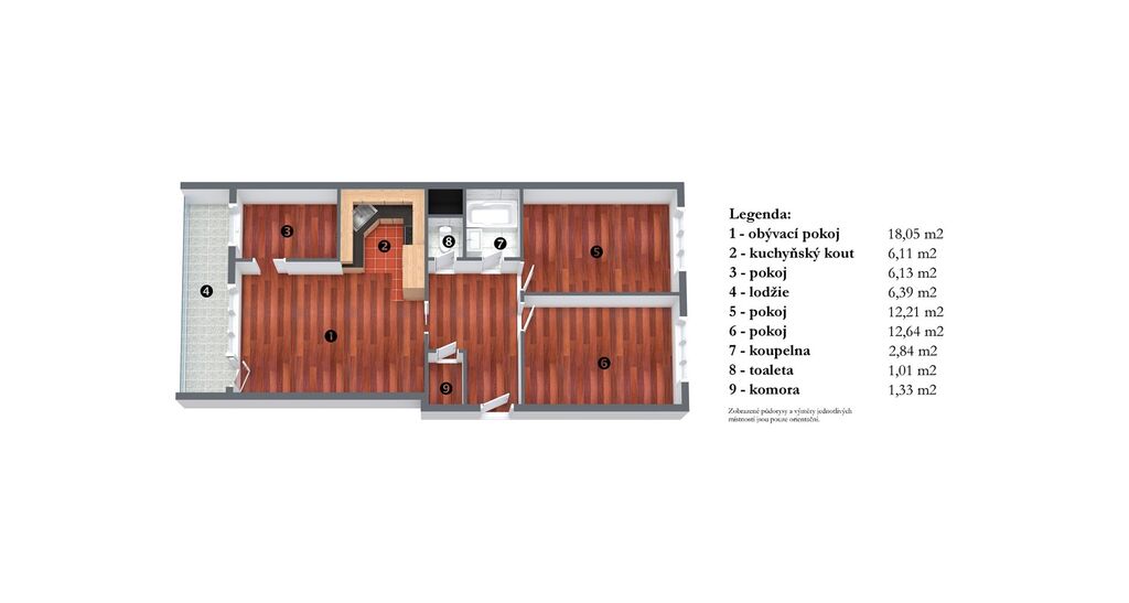 • Prostorný interiér: Celková výměra 70,90 m² – předsíň (9,83 m²), kuchyň (12,26 m²), pokoje (18,66 m², 12,6 m², 12,25 m²), koupelna (2,83 m²), WC (1,04 m²), komora (1,33 m²) a lodžie (6,38 m²).