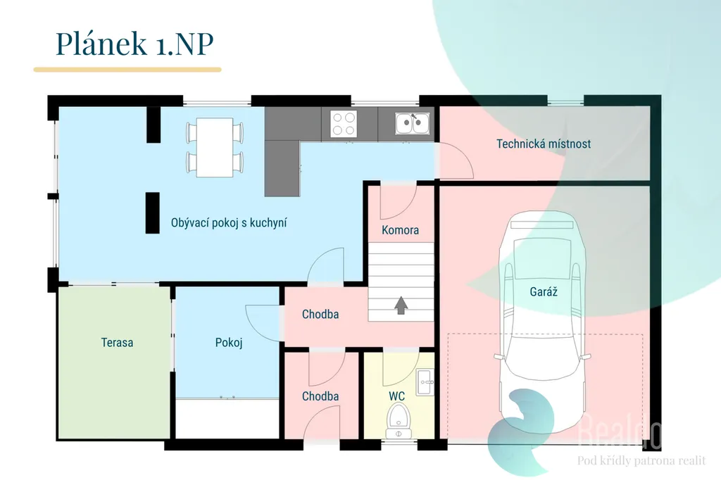 Přízemí: prostorný obývací pokoj s kuchyňským koutem, samostatný pokoj, technická místnost, komora, WC, zastřešená terasa a garáž.