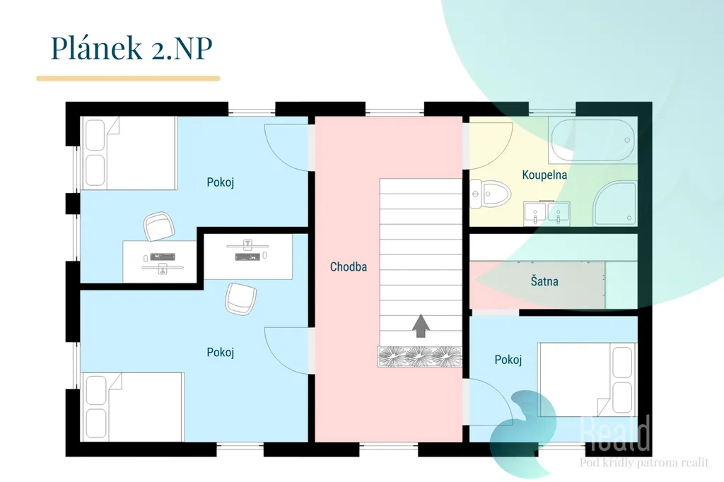 Patro: tři světlé pokoje, šatna a koupelna s vanou i sprchovým koutem.