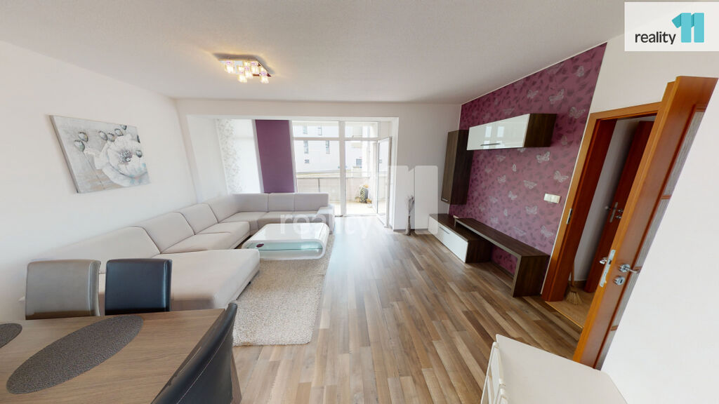 Dispoziční členění: obývací pokoj s kuchyňským koutem 38,23 m², ložnice 13,77 m², dětský pokoj 8,36 m², dětský pokoj II. 8,36 m², chodba 12,98 m², koupelna 6,2 m² a samostatné WC 1,8 m². Dále jsou k dispozici dvě prostorné terasy a vlastní sklepní kóje.