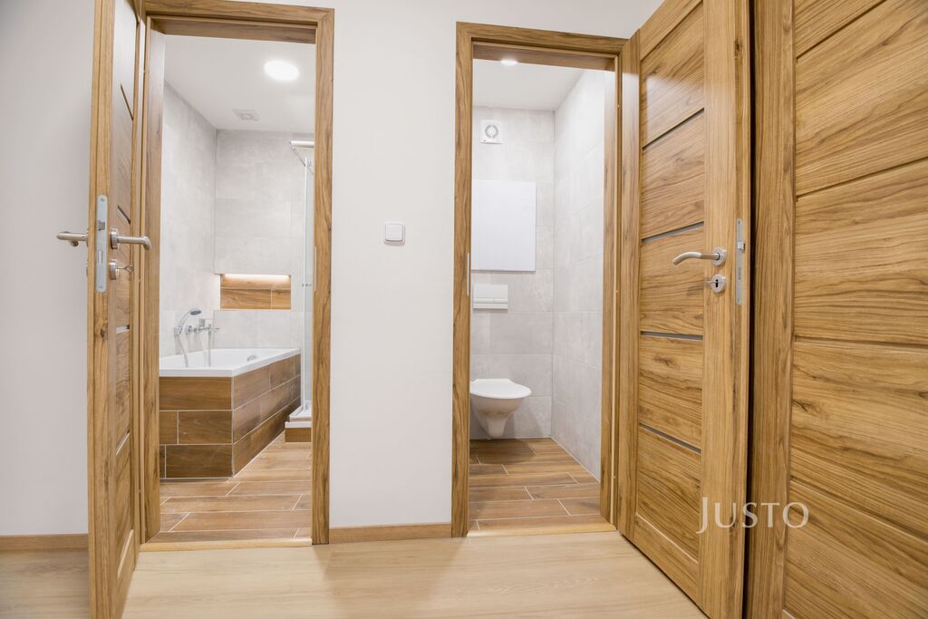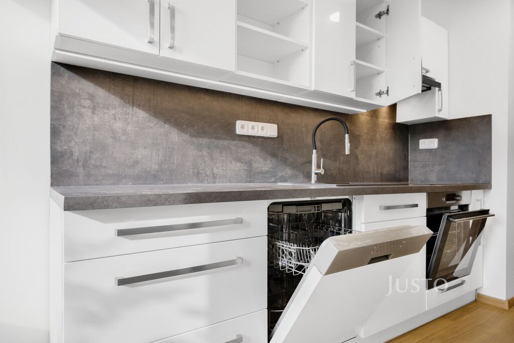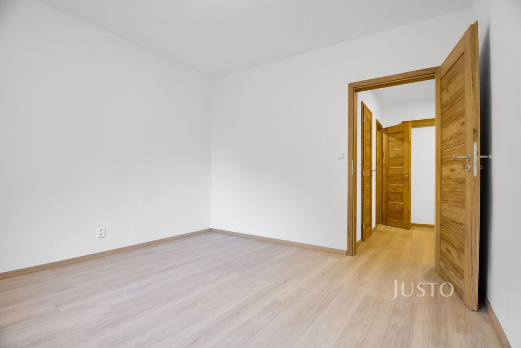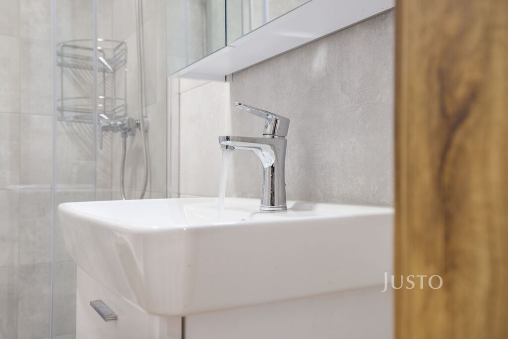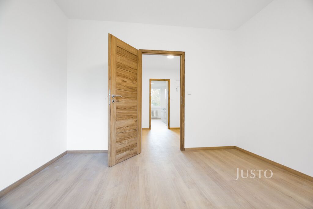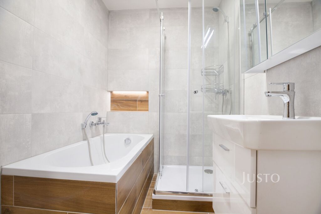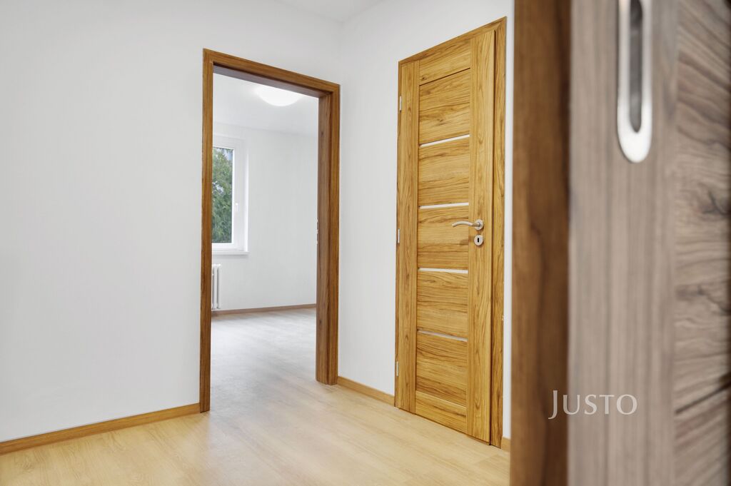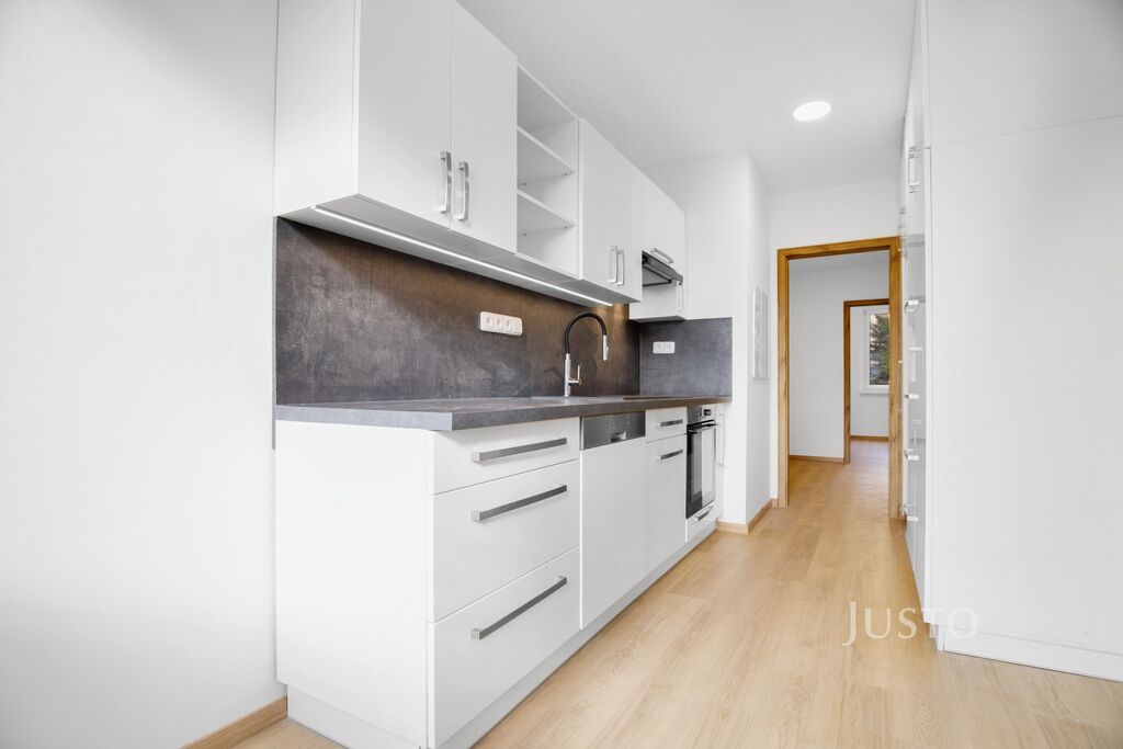 Interiér bytu prošel kompletní modernizací a nabízí světlou kuchyň s nadčasovou linkou, vestavěnou myčkou, elektrickou troubou a varnou deskou. Koupelna je vybavena vanou i sprchovým koutem, sanitární zařízení a obklady byly zvoleny v příjemných neutrálních tónech, které působí velmi elegantně. Toaleta je oddělená. Podlahy jsou řešeny v kombinaci kvalitního vinylu a dlažby, interiérové dveře mají dřevěný design a podtrhují moderní atmosféru bytu.
