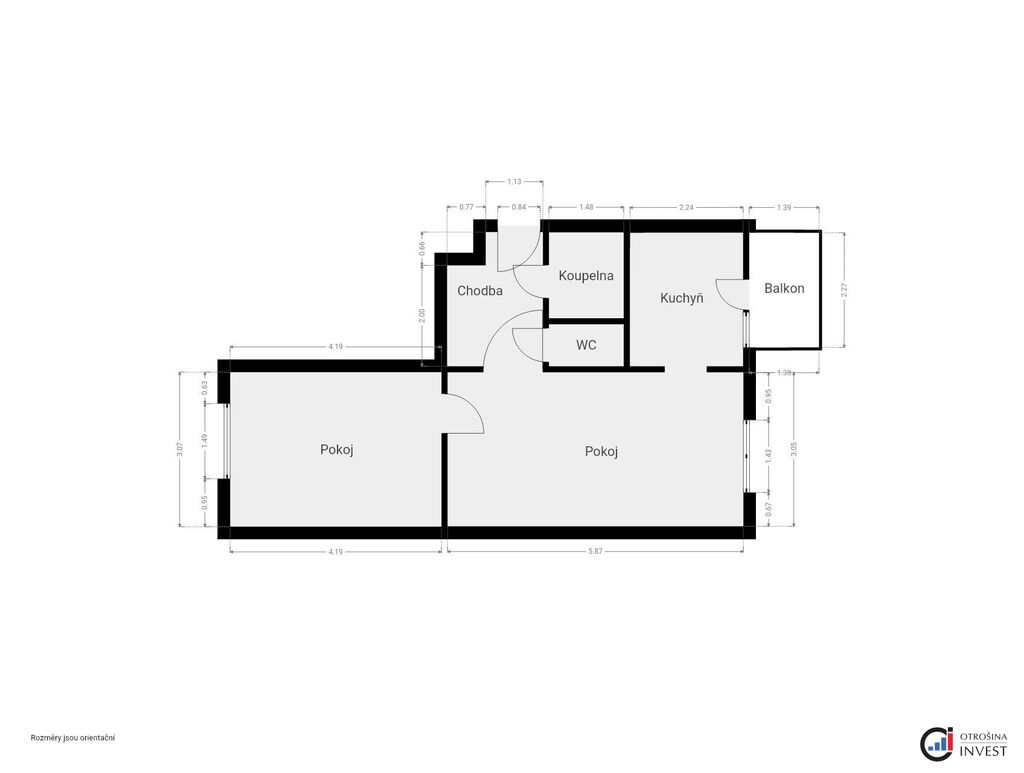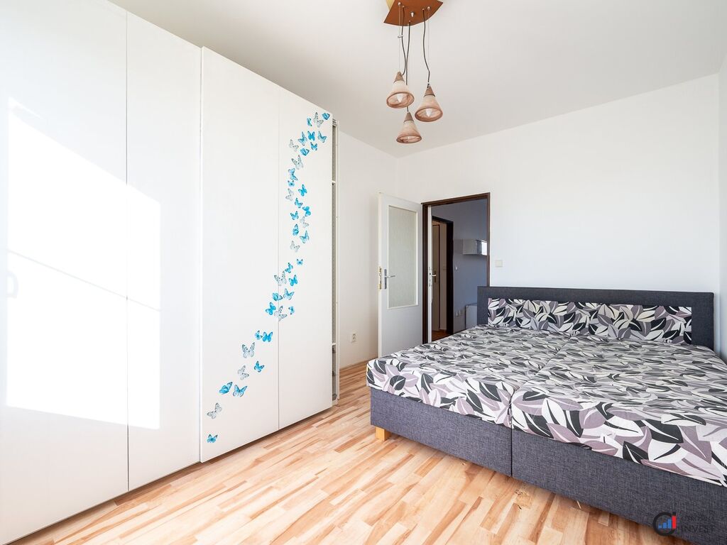 Dispozice: pokoj s kuchyňskou linkou, obývací pokoj, ložnice, koupelna s vanou a WC.