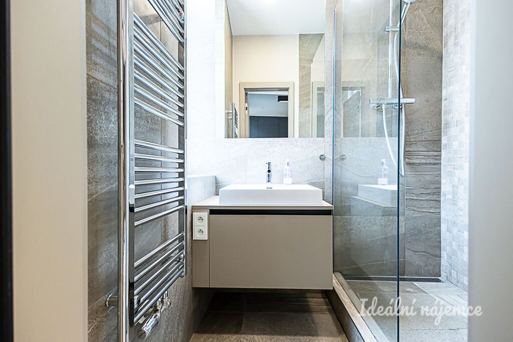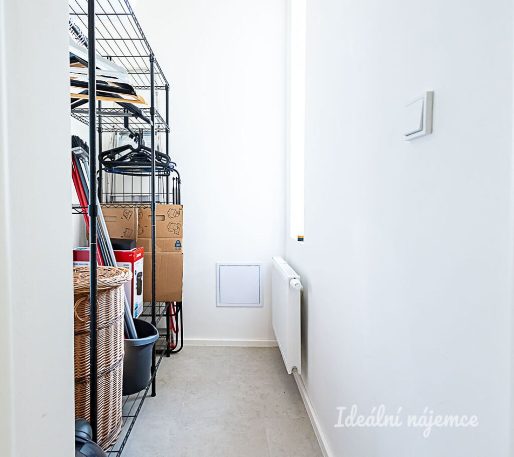 Byt je částečně vybavený, což umožňuje doladit interiér podle vlastního vkusu. Kuchyně je vybavena lednicí s mrazákem, elektrickou a mikrovlnnou troubou, indukční varnou deskou, digestoří a myčkou, a součástí kuchyně je stylové jídelní posezení. Obývací pokoj nabízí pohodlnou sedací soupravu, konferenční stolek, úložný prostor, televizor a pracovní kout. Samostatný pokoj je zařízen manželskou postelí, koupelna disponuje sprchovým koutem a umyvadlem, toaleta je samostatná. K bytu patří také praktická úložná místnost, kterou lze využít jako šatnu.