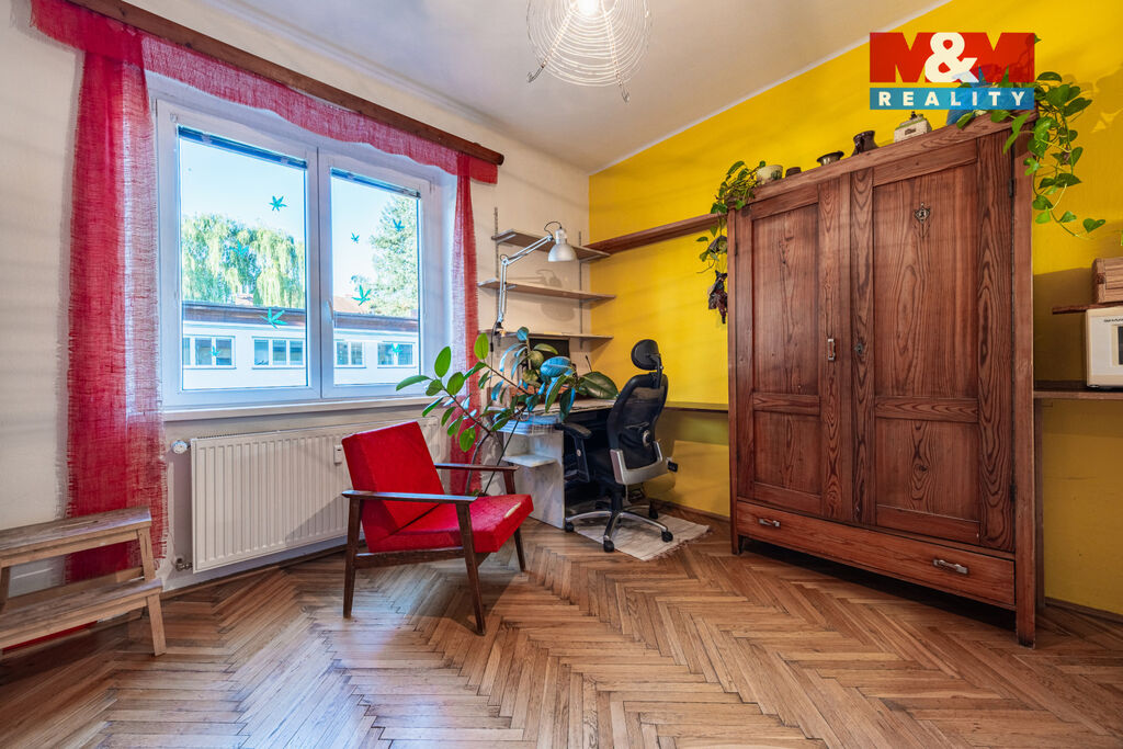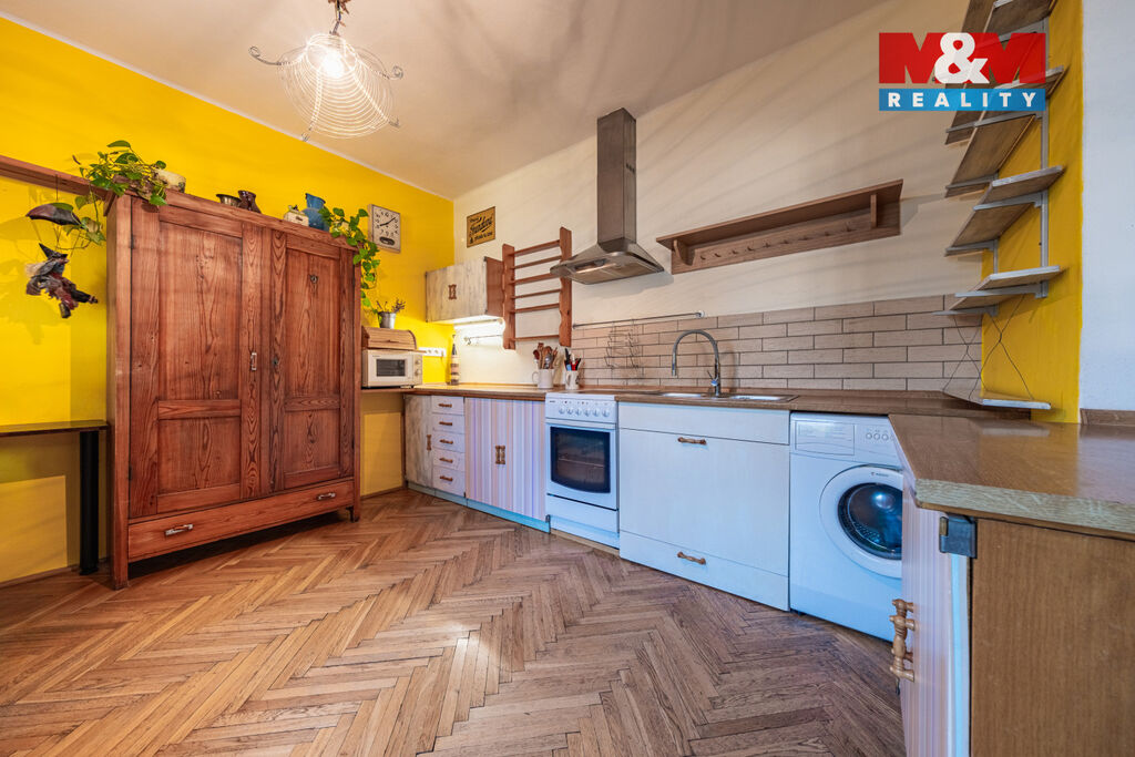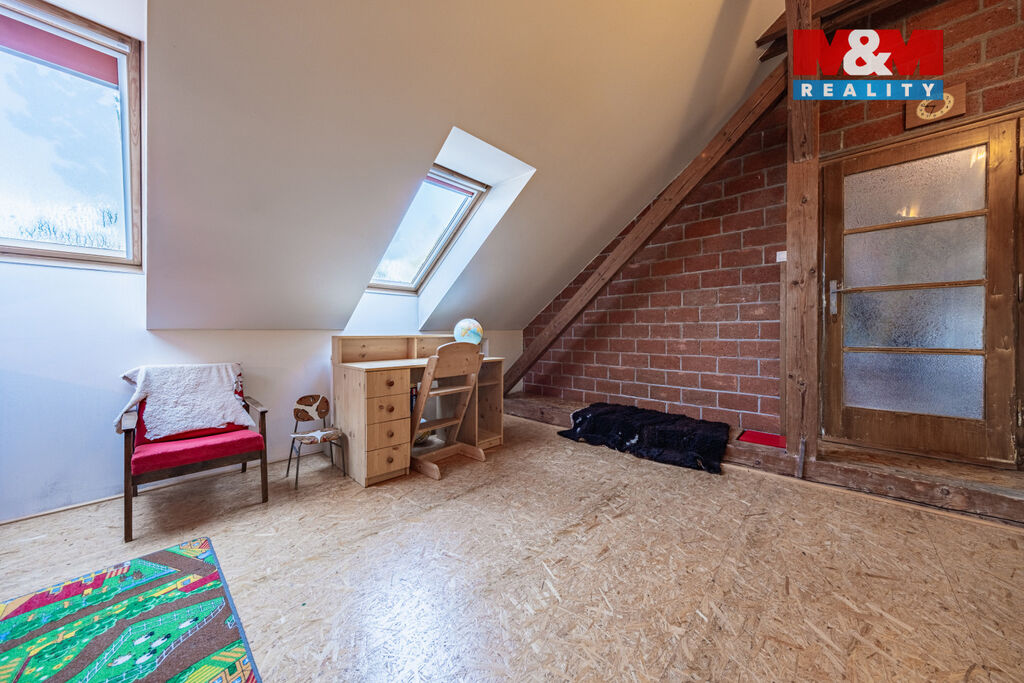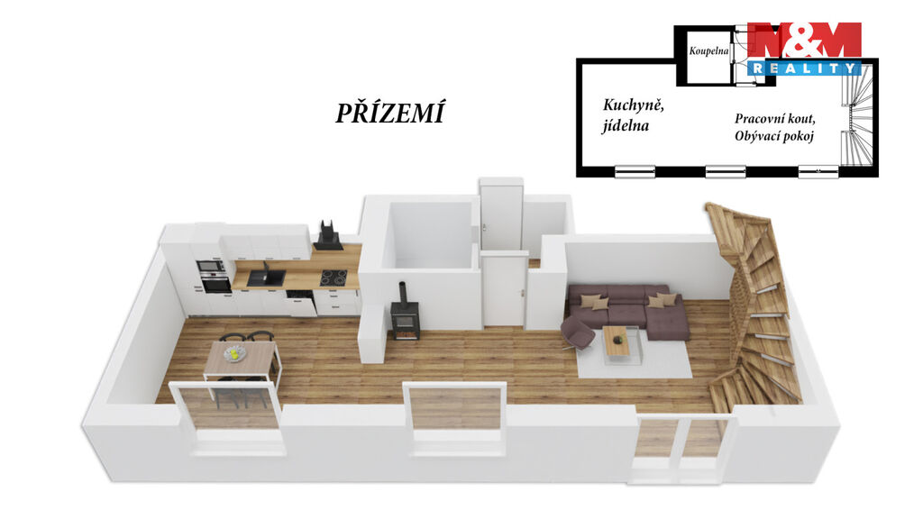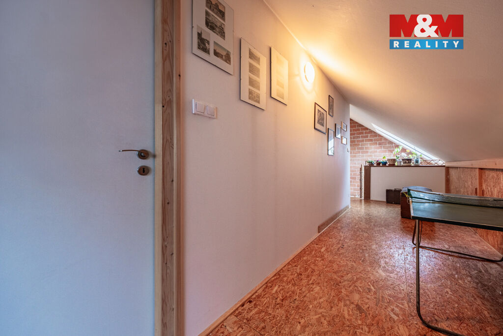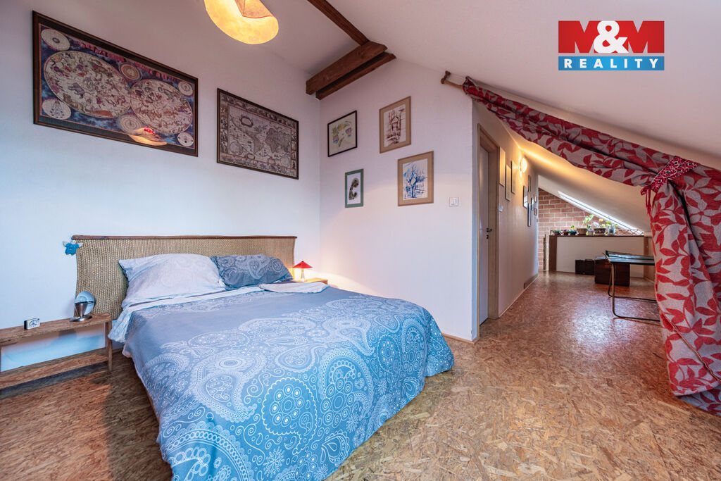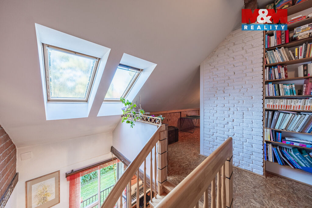 Ve spodním podlaží Vás přivítá předsíň a prosluněný obytný pokoj se stylovými kamny. Otevřený průhled do patra dodává bytu vzdušnost; na druhém konci je velká kuchyně s pracovním koutem. Všude masivní dřevěné parkety, z předsíně vstup do koupelny s vanou a WC. Po dřevěném schodišti vystoupáte na galerii s knihovnou. Napravo je dětský pokoj, nalevo samostatné WC, dále světlá ložnice a za ní prostorná šatna.