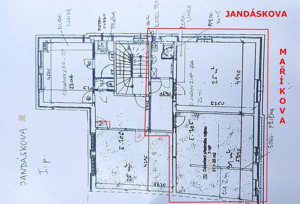 Pronájem hezkého bytu o dispozici 3+kk na ulici Jandáskova (roh Jandáskova x Maříkova). Byt se nachází v 1. patře zateplené cihlové budovy bez výtahu. Celková plocha bytu činí 65m2. Koupelna se sprchovým koutem a toaletou, dále pokoj o velikosti cca 22m2, ložnice 9m2, obytná kuchyň s kuchyňským koutem (25m2) a předsíň. Celý byt prošel před pár lety kompletní rekonstrukcí,.. instalována nová kuchyňská linka, s vestavnou troubou, plynovými hořáky, digestoří, myčkou, lednicí, dále nevybaveno. Podlahy (PVC a dlažba), nové LED podhledová svítidla, a mnohé další. Vytápění pomocí kombinovaného plynového kotle, který je propojen s termostatem (úspornější varianta vytápění). Velkou výhodou bytu je vyhrazené parkovací stání, které je již v ceně nájmu. Parkovací stání je za bránou. Cena pronájmu činí 19.000,-Kč + zálohy na služby a energie (cca 3.500,- Kč). Celkem tedy 22.500,-Kč včetně energií, služeb a parkovacího stání pro jednu osobu, každá další + 500,- Kč. Na byt nelze pobírat příspěvky na bydlení. V případě zájmu o prohlídku kontaktujte telefonicky nebo do emailu uvádějte prosím telefon (snadnější komunikace). Na dotazy bez telefonu nebude odpovězeno. RK