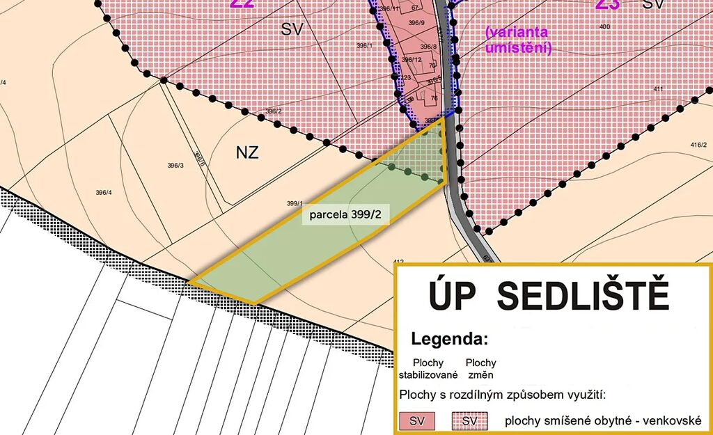 Dle územního plánu je cca 1 500 m² součástí plochy smíšené obytné – venkovské, která umožňuje výstavbu rodinných domů, usedlostí s hospodářským zázemím, dále obslužnou sféru a nerušící výrobní činnosti. Zbývajících cca 7 993 m² je zařazeno jako plocha zemědělská.