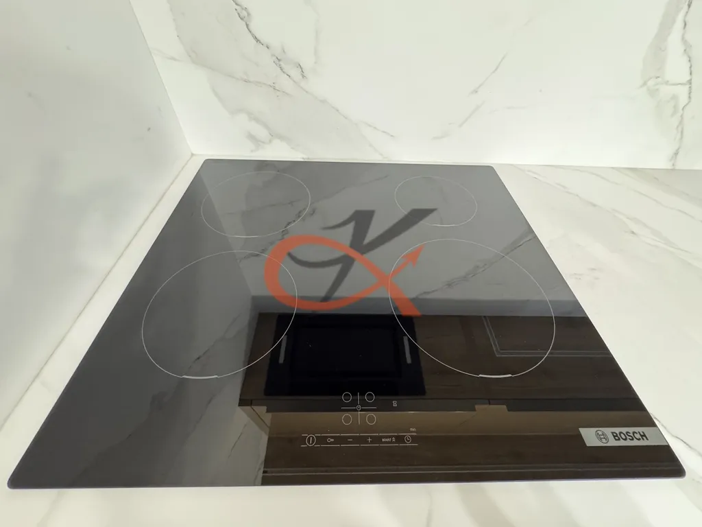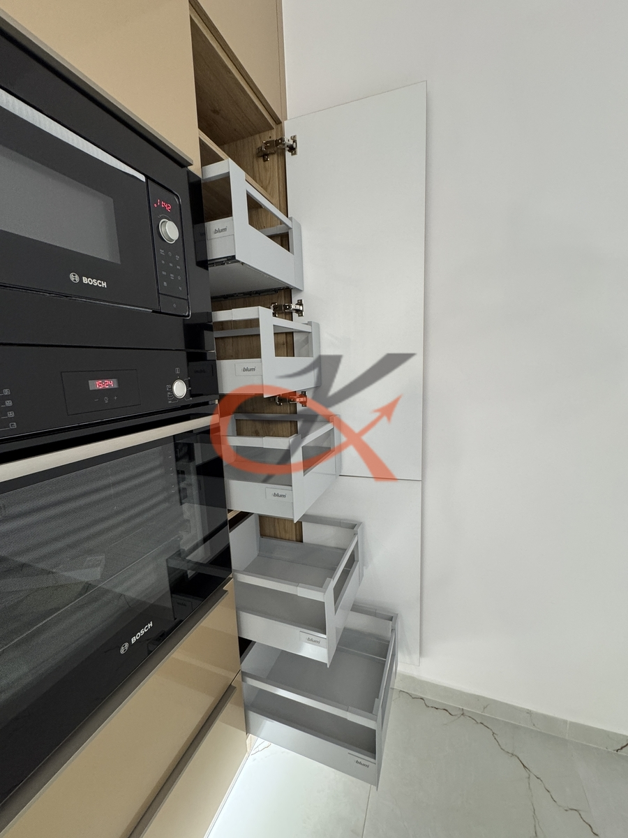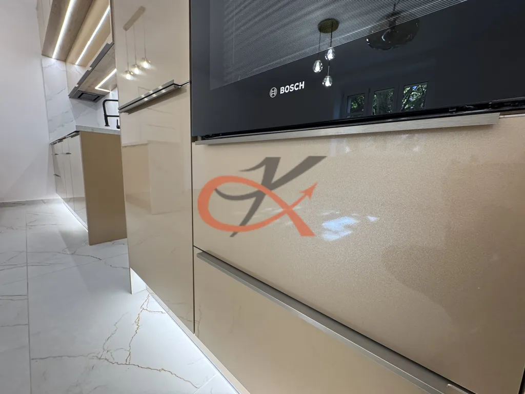 Dominantou bytu je luxusní kuchyňská linka v třpytivě zlatém dekoru, doplněná černými vestavěnými spotřebiči Bosch – indukční varná deska, horkovzdušná i mikrovlnná trouba, myčka, digestoř a lednice s mrazákem. Linka je osazena výsuvnými systémy značky Blum pro maximální komfort a kvalitu zpracování.
